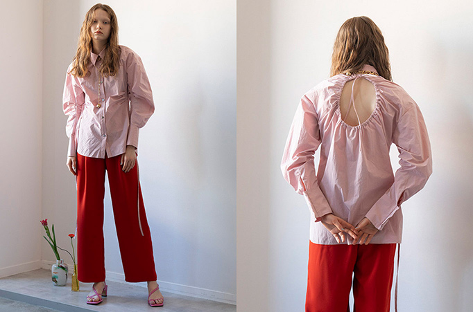 構築的な円形のボリュームをもたせたサーキュラーショルダーと、背面のバックオープンデザインが特徴の女性らしさあふれる一着。マイルドな発色とナチュラルなシワ感できれいめになりすぎず、コーディネートへの取り入れやすさも◎。体型カバーの効果もあるミドル丈で、胴周りにギャザーを入れることでふんわりとした柔らかいシルエットに仕上げています。