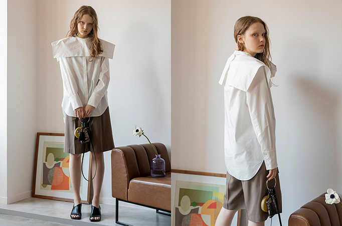 今季注目の大きな襟を甘さのないスクエアカラーにすることで、モードな雰囲気をお楽しみいただけるシャツ。襟は前後2WAYでつけることができて、ニットやカットソーの上に単品で使うことも可能。国内有数のシャツ生地メーカーの生地を使用しており、上品なのに機能性も兼ね備えているところもポイント。