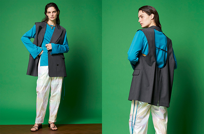 大胆なバックホールのデザインを上品さのある生地で仕上げ、ラフになりすぎないスリーブレスジャケット。セミダブルのクラシカルなシルエットでありつつ、ゆったりとした長めの着丈でコーディネートのバランスのとりやすさも◎。