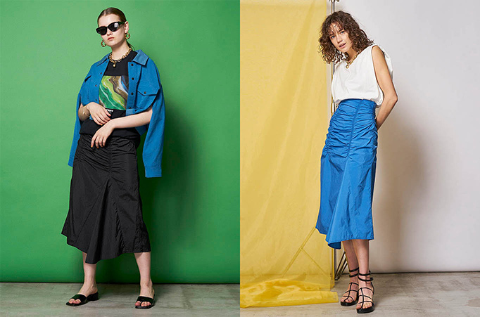 斜めのラインに施されたシャーリングと配色ステッチが甘くなりすぎない大人のマキシスカート。今シーズンは素材違いで、さらりとした夏らしいサッカー素材と、スポーティーさのあるワッシャー素材の2種類をご用意。サッカー素材はガーリーになりすぎないモノトーンで、コーディネートを引き締めてくれます。ワッシャー素材はビビットなカラーリングでアクティブな夏にぴったり。