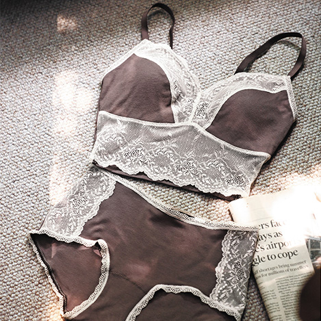 たっっぷり使ったレースが大人のかわいらしさがあるインナーシリーズ。「キッドブルー」ならではの伸びがよく心地よい肌触りのレーヨンベアフライス地に広幅レースをプラス。着やすさはそのままに、配色が新鮮です。