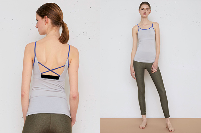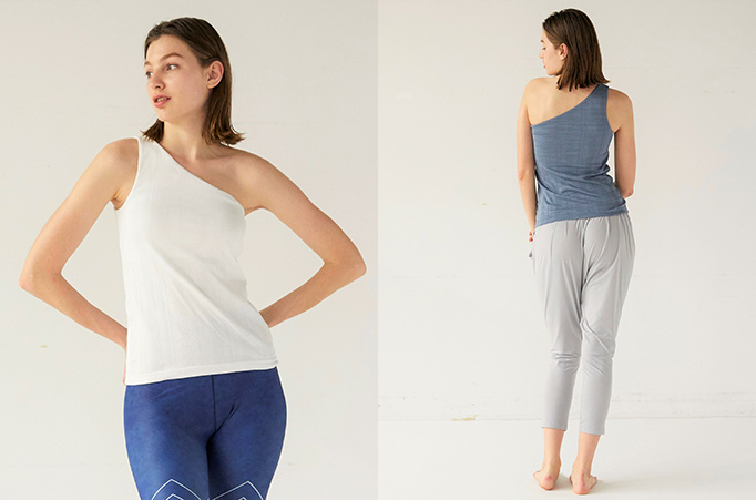 パット付きなので、デイリー使いからヨガやワークアウトにも一枚で着られる便利なアイテム。締め付け感が少なくストレスフリーな着心地も魅力的。ワンショルダーのネック周りはゴムでしっかりホールドされているので、ハードなヨガでも安心です。