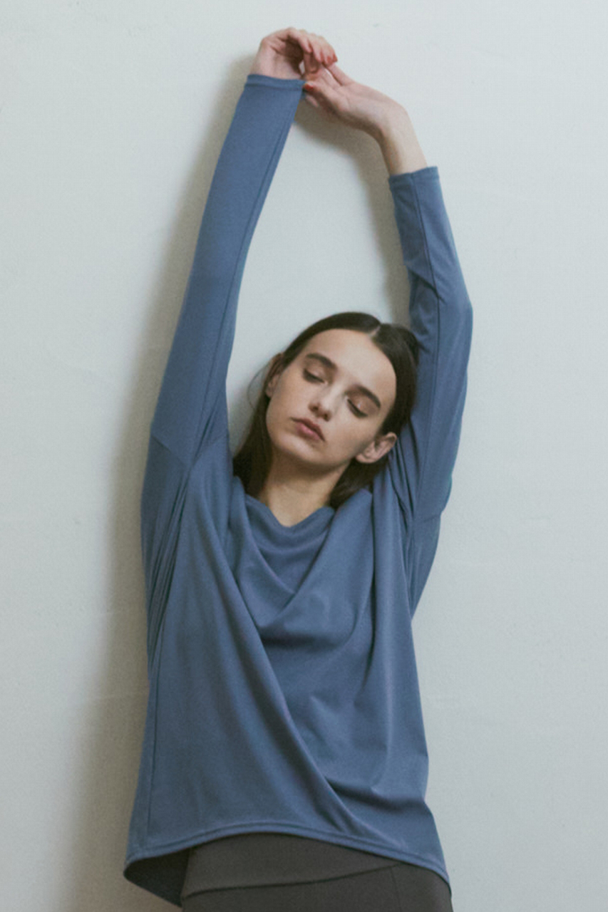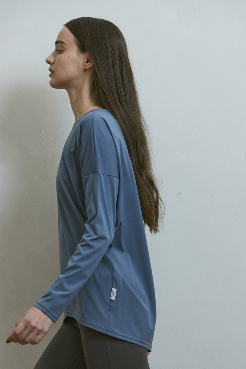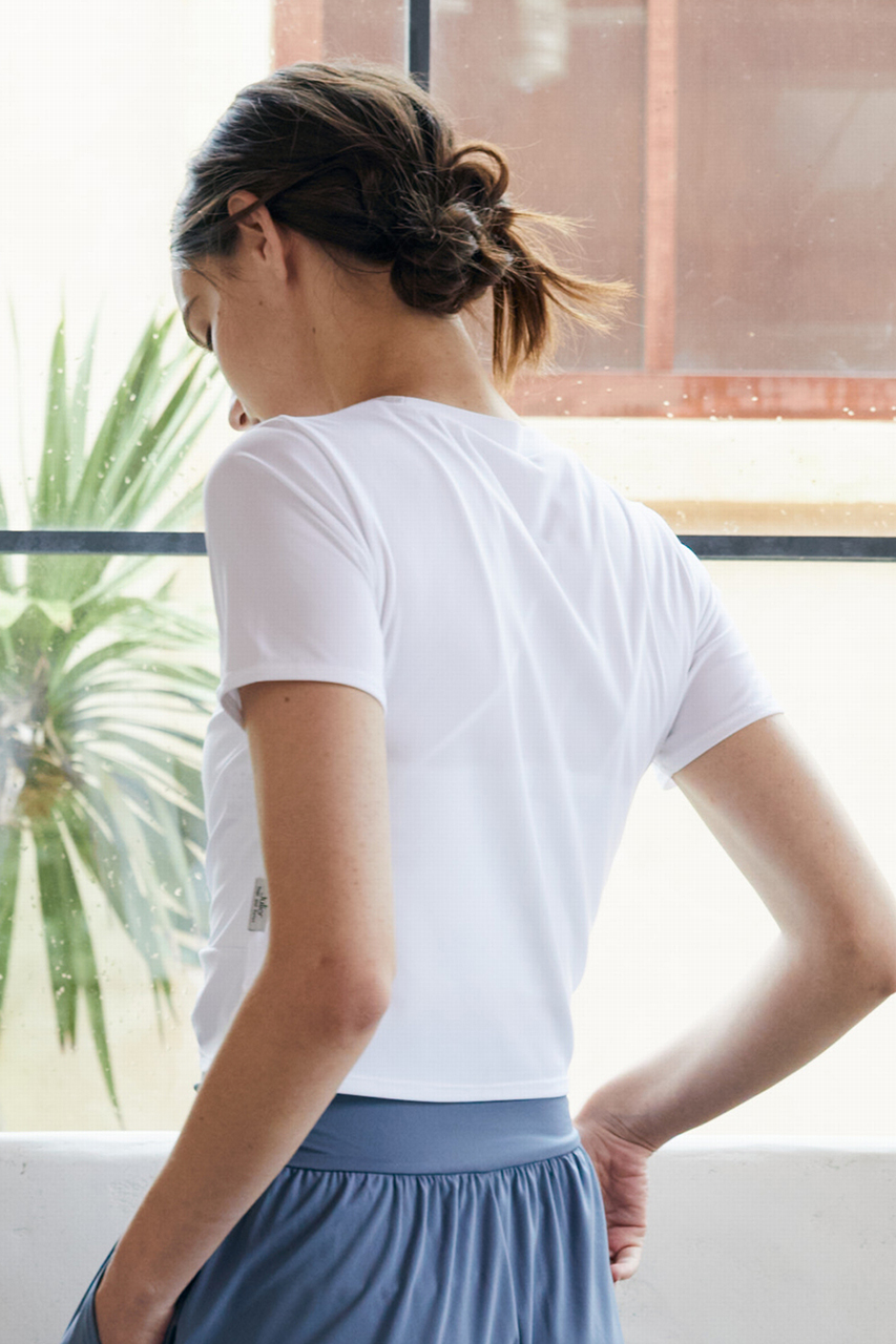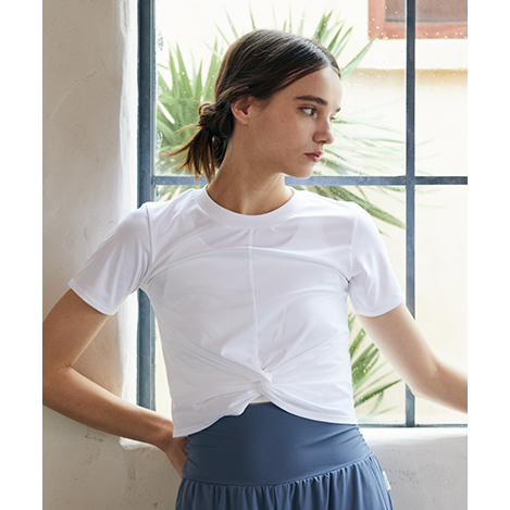 どんなボトムスとも合わせ易く、すっきりとしたシルエットは、着るだけで脚長効果も叶う1枚。ヨガやワークアウト中もスタイルアップでモチベーションが高まります。