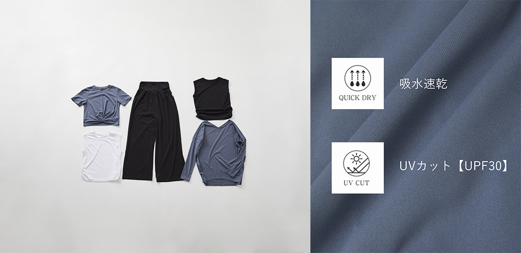 アクティブフロースムースシリーズは、吸水速乾、UVカット、透け防止を備えた高機能素材です。