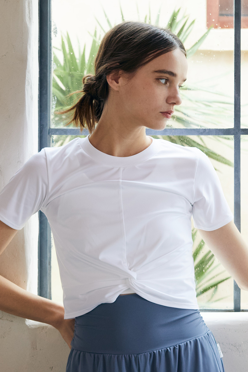 半袖のコンパクトTシャツは、前裾のクロスデザインがさりげないアクセントとなり、シンプルながらおしゃれ感をプラス。