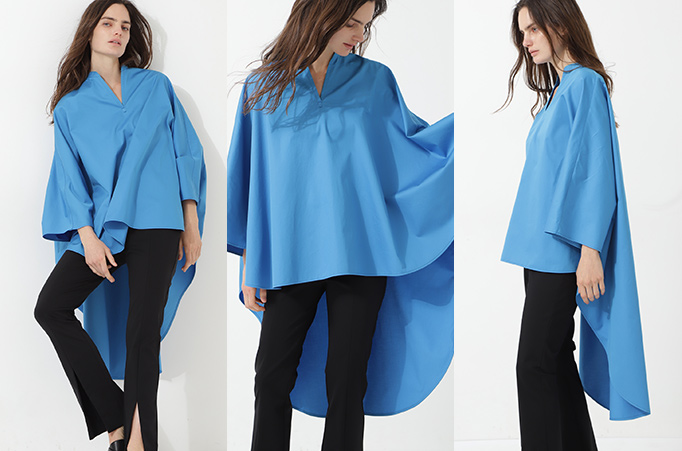 着丈に大胆な前後差をつけ、シンプルながらも分量やラウンドヘムのカッティングにもこだわった存在感あるブラウス。