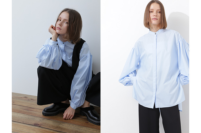 アームからバックヨークにかけての切り替えからたっぷりとタック&ギャザーを寄せ、デザイン性を持たせたバックシャンなブラウス。着丈に前後差を付け、後ろは腰周りがしっかり隠れるレングス。サイドはスリットデザインで、軽やかな印象です。シワになりにくく、回復も早い、うれしいイージーケア。羽織りとしても、サロペットやニットベストのレイヤードにもバランスよくスタイリングしていただけます。完売のベージュは追加生産決定! 先行予約受付中。