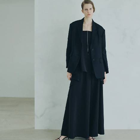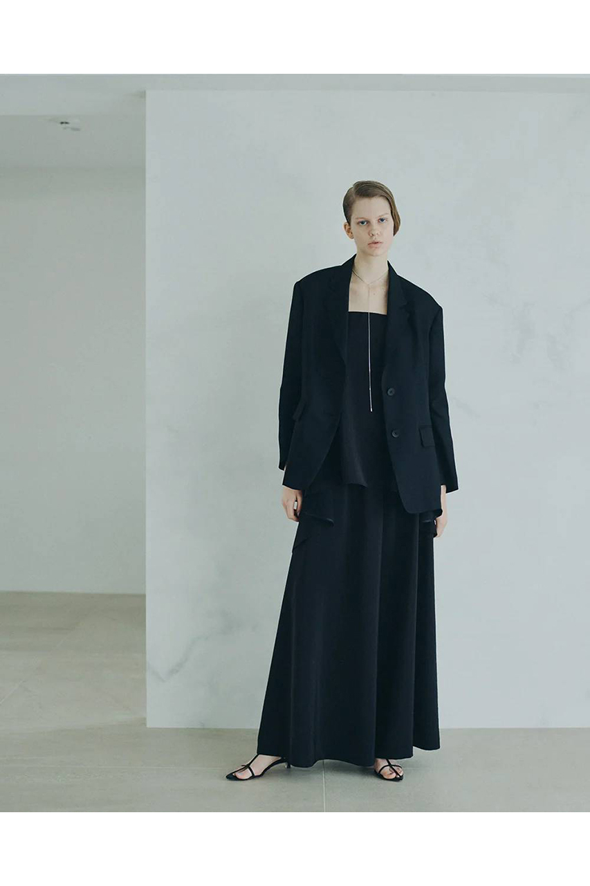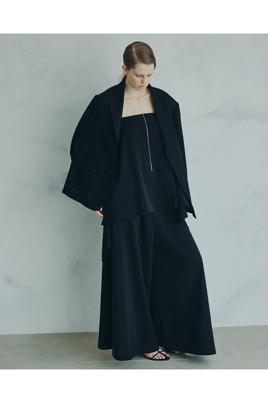 ヘムデザインの特徴的なインナーとドレープが映える上品ワイドパンツで、歩くたび軽やかな揺れが着こなしに奥行きを演出。