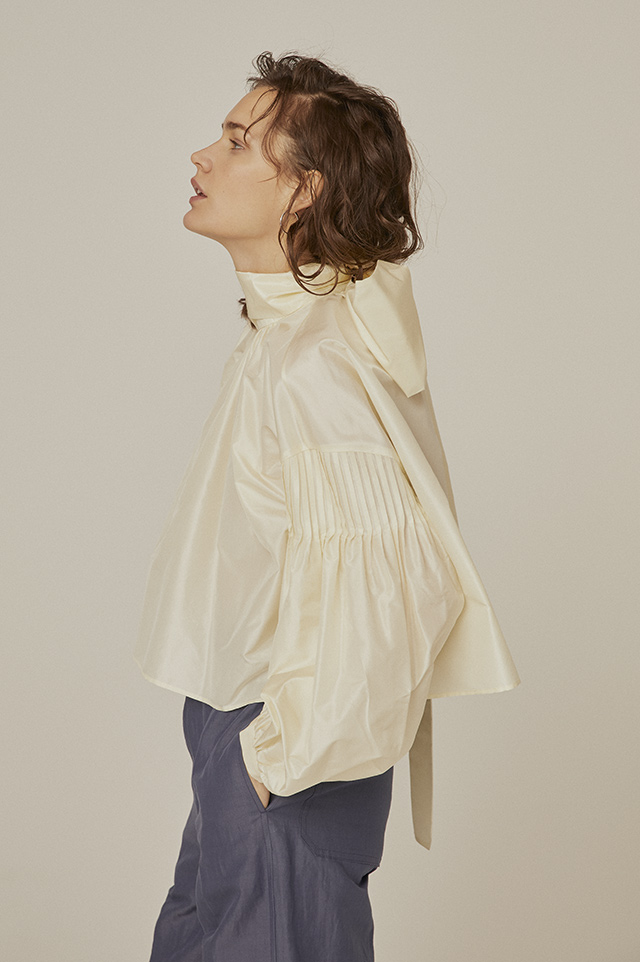 ボリューム感のあるスカーフカラーとスリーブフォルムのブラウスは一枚でスタイルが決まるアイテム。シルクの光沢感がラグジュアリーなムードをプラスしてくれます。トップが華やかな分、ボトムはシンプルにするのがバランスをとるポイント。くすみブルーがマニッシュな印象のリネンコットンパンツと相性抜群です。