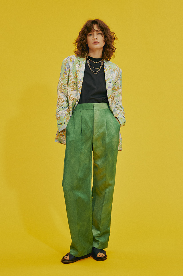 ハッピームード漂うグリーントーンのジャケットスタイル。ボタニカルモチーフのプリントジャケットとケリーグリーンのビビッドカラーパンツはどちらもゆったりとした今年らしくカジュアルダウンしたシルエットに。インナーに深ネイビーを合わせて全体の印象を引き締めて。