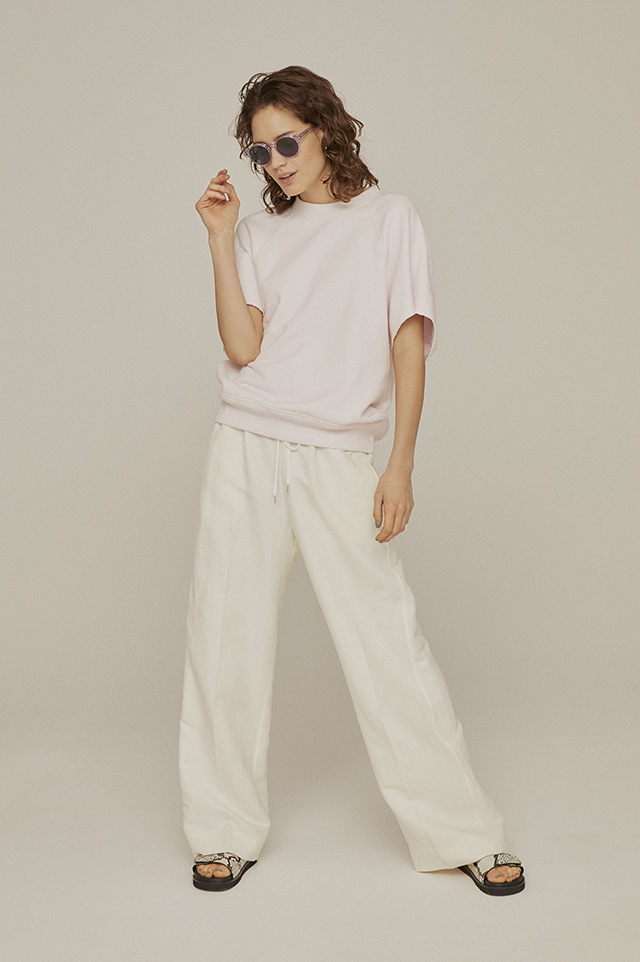定番のスウェットスタイルを上質な素材感と計算され尽くしたシルエットでブラッシュアップ! ライトピンク×オフホワイトのシュガートーンも甘くなりすぎずに仕上がります。センタープレスがきちんと感出してくれるリネンシルクのホワイトパンツはウエストゴムでリラクシーなはき心地が◎。