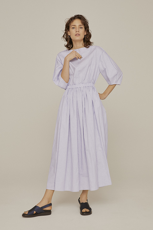 コーディネートいらずのワンピースは品よく見える立体的なシルエットが長く愛せる一枚を選ぶポイント。ほどよく絞ったウエストから広がるAラインのロングワンピースは、ボリューム感のある5分袖からのぞく手首や足首など、身体の華奢な部分を引き立たせてくれるラインが「ブラミンク」ならでは。ハリのあるリネンコットン地を贅沢に使った大人のサマードレスです。