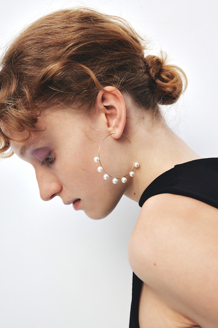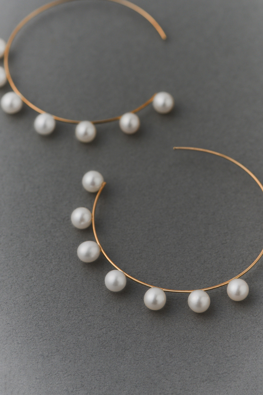 流れるようなフープラインに淡水パールが浮かぶ、気品とエッジが交差するピアス。K10のしなやかな光沢が、パールの存在感を引き締めます。ポストを留める位置によって、フープの表情を自在に調整できるのも魅力。耳元に沿わせたり、緩やかな曲線を描かせたりと、留め方ひとつで印象が変化します。バックオープンのトップスなど、肌を見せる装いとも好相性。