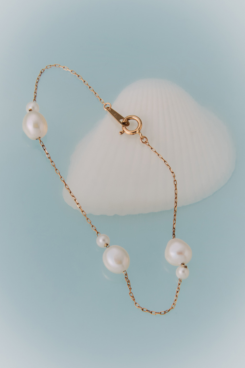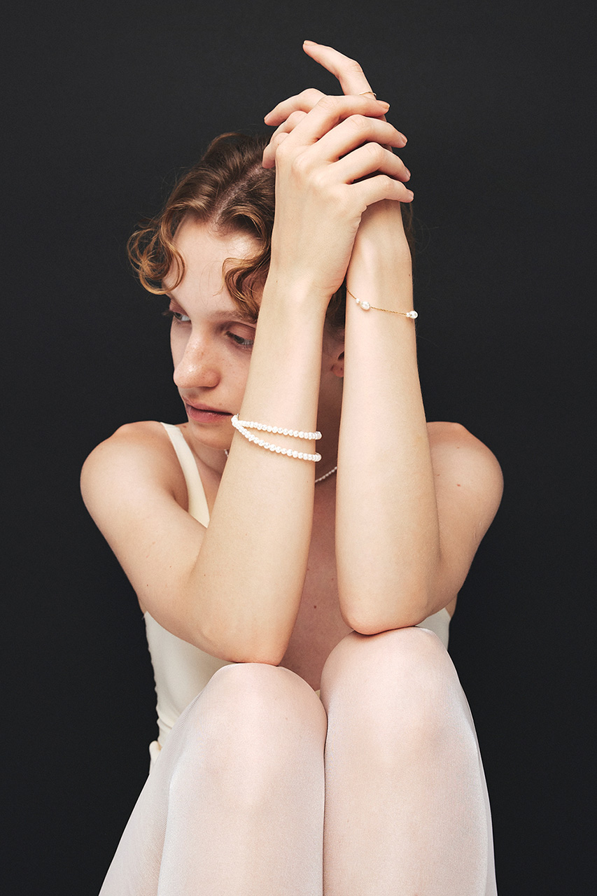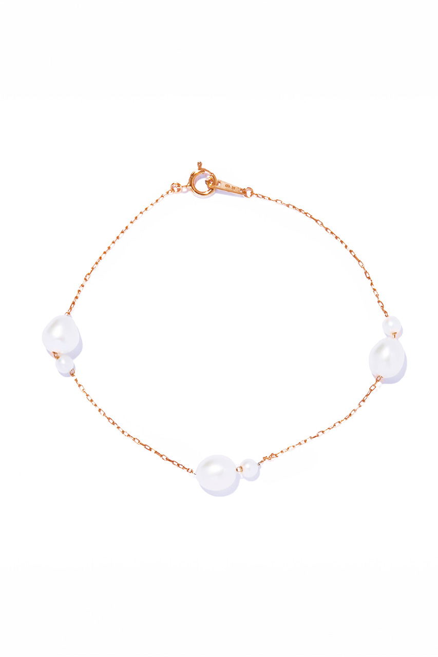 素肌にそのまま纏えば、パールの艶と肌とのコントラストが際立つブレスレット。淡水パールとK10チェーンが継ぎ目なく溶け合い、視線を途切れさせない一本のラインを描きます。手元に沿う構築的なフォルムが、仕草にさりげないニュアンスを添えて。