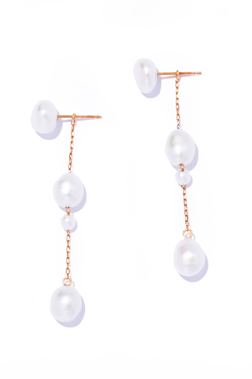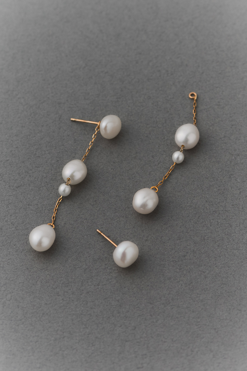耳元で揺れるピアスは、顔まわりに洗練をプラス。滑らかな光沢の淡水パールと繊細なゴールドチェーンが連なり、縦のラインが際立つ端正な佇まいに仕上げています。