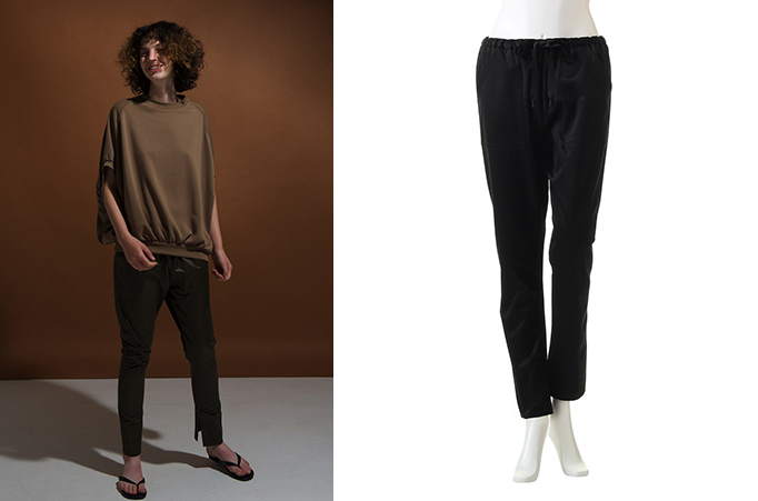 今シーズン一番人気のシルエットで、裾内側のスリットが特徴的なスリムパンツ。非常にハイゲージな特殊な糸を使用していて、控えめな光沢とハリが特徴です。脇線がシームレスで、ほどよい緩みの腰周りから膝にかけて急激に細くなる特殊なパターン。ウエストのドローストリングとアウトポケットがモードよりの素材にややカジュアルな印象をプラスしています。着用時にほどよく裾が広がって見える裾のキック(跳ね上がり)がデザインポイント。ブラック・ミリタリーの2色展開。