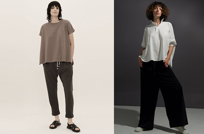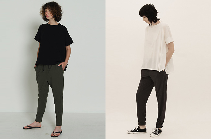 ファーストコレクションからの人気のトラウザーズのウエスト部分を、ドローストリング+ゴム入りにアップデート。リラックスしたはき心地をキープしつつも、定番のシルエットできちんとした印象を与える新型です。落ち感のよい素材を使用し、裾をアジャストする事で生まれる足首の溜まりが、全体的にゆったりとした太めのシルエットの割にスマートに見せてくれます。ペットボトルのプラスチック再利用で生まれたサステナブルなポリエステル100%を使用しており、シワになりにくくクールなタッチで落ち感がよいのが特徴。コットンのように褪色せずリュクスな印象で、とても柔らかくストレスフリーな素材です。ほどよい肉感とボリュームなので、透け感が少ないのも特徴。アーミー・ブラックの2色展開。