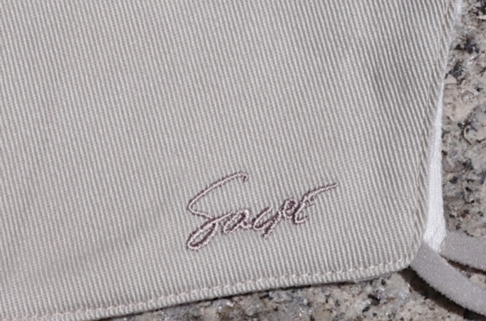 表地には、ブランドロゴの「Sacre」の刺繍が施されており、毎日つけたくなるおしゃれマスクです。スタンダードのコットン100%ツイル素材(ライトベージュ)、涼し気な表情の麻混素材(グレージュ)の2タイプ。3層構造で中には不織布を縫い込んでいますので、安心してお使いいただけます。紐も平たく伸びのよい柔らかなグレーを使用していますので、ファンデーションがうつる心配も、耳の痛みを感じることもありません。