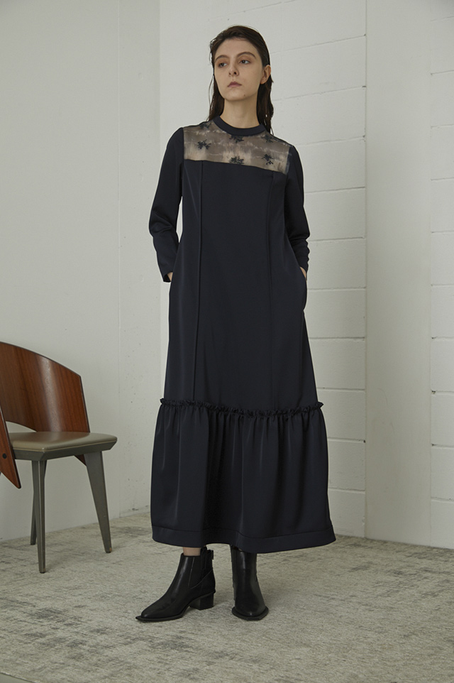 ふくらみとドレープ性をもった、ソフトな手触りで快適な着心地のストレッチサテンと「リムアーク」オリジナルプリントに刺しゅうを施した生地を組み合わせデザインしたドレス。生地の組み合わせ方、裾のハリ感やシルエットにこだわったオケージョンでも他に差をつけることのできるドレスです。