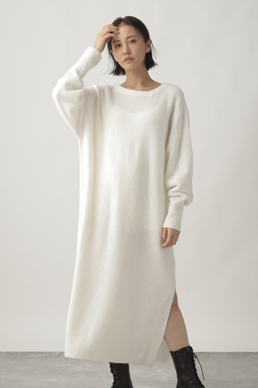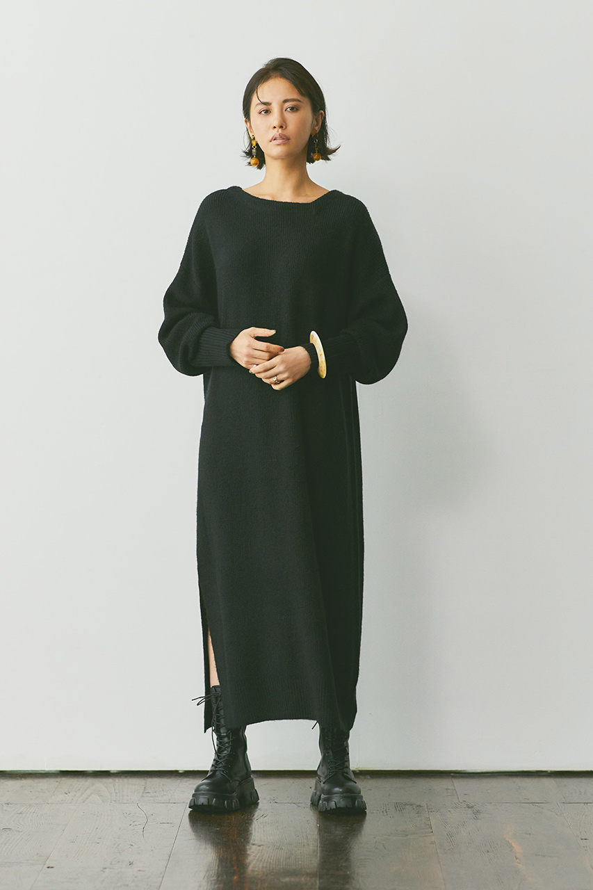 アシンメトリーなネックラインが上品なニットワンピースが新着。