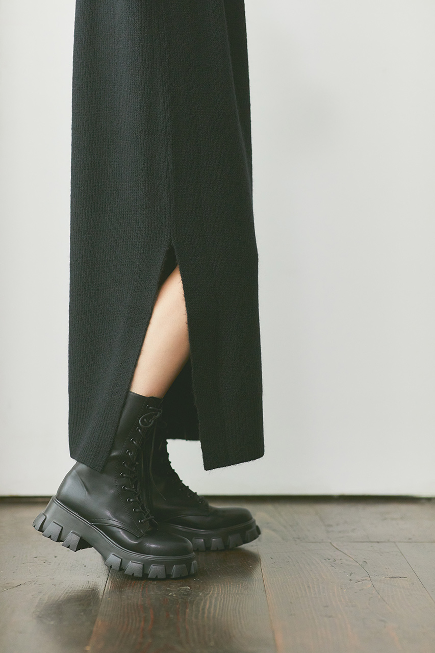 足元にスリットが入っているので、ロングでもバランスが取りやすく、スカートやパンツ・レギンスを合わせてももたつきません。