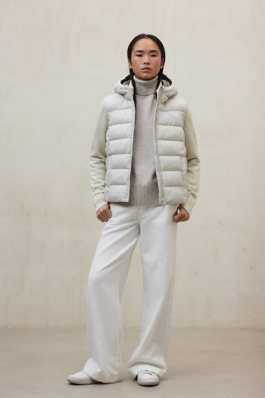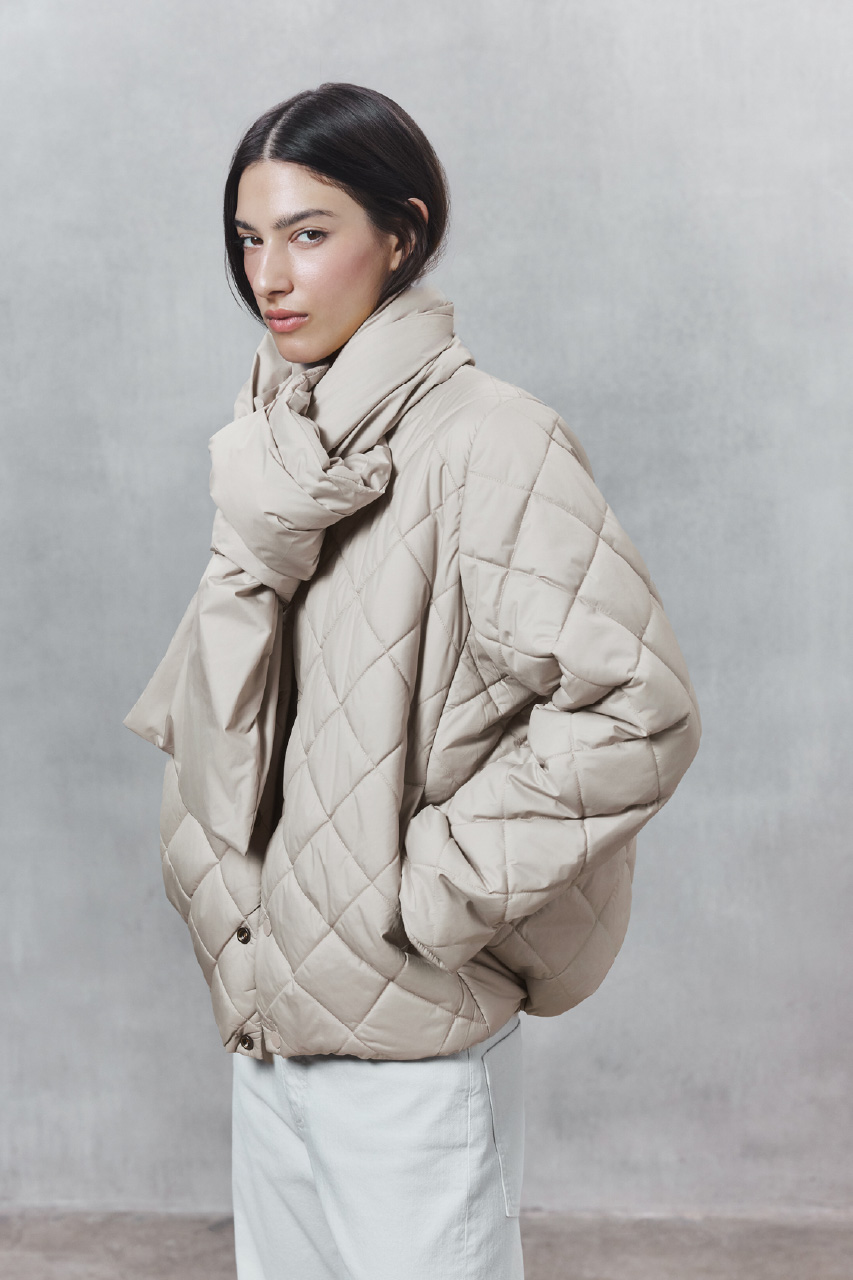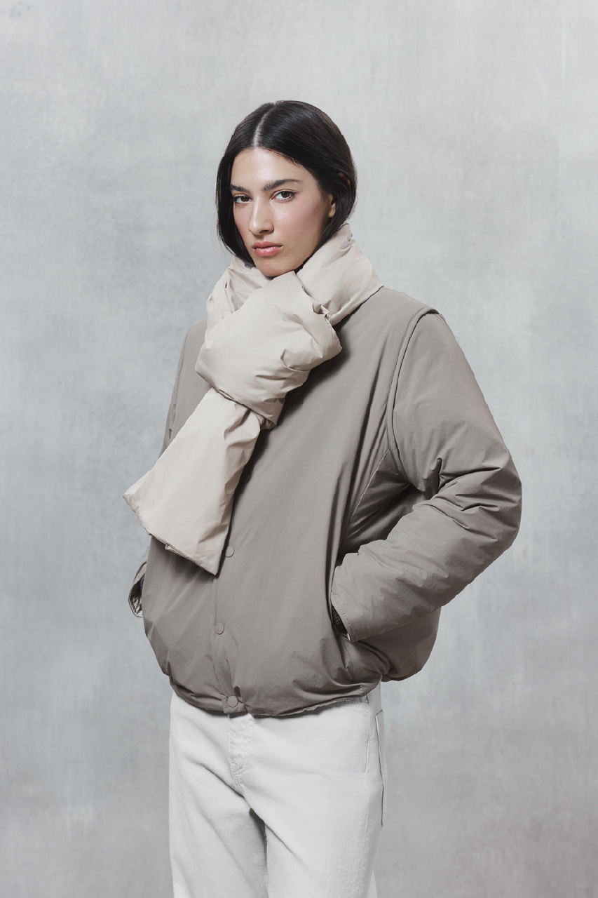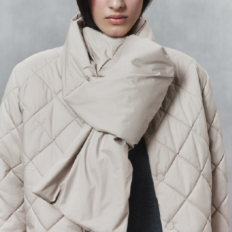 【ELLE SHOP 限定】の中綿アウターは、無地とキルティング、2つの表情を楽しめるリバーシブル仕様。同素材のマフラー付きで、防寒はもちろんスタイリングのアクセントにも活躍します。中綿にはペットボトル由来のリサイクルポリエステルを使用し、軽やかな着心地も魅力。