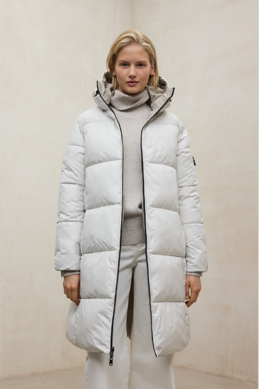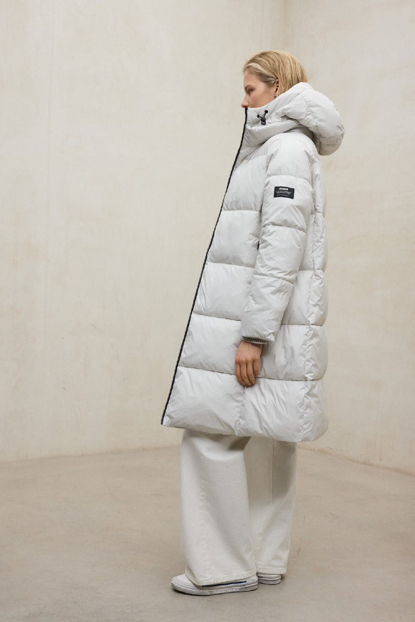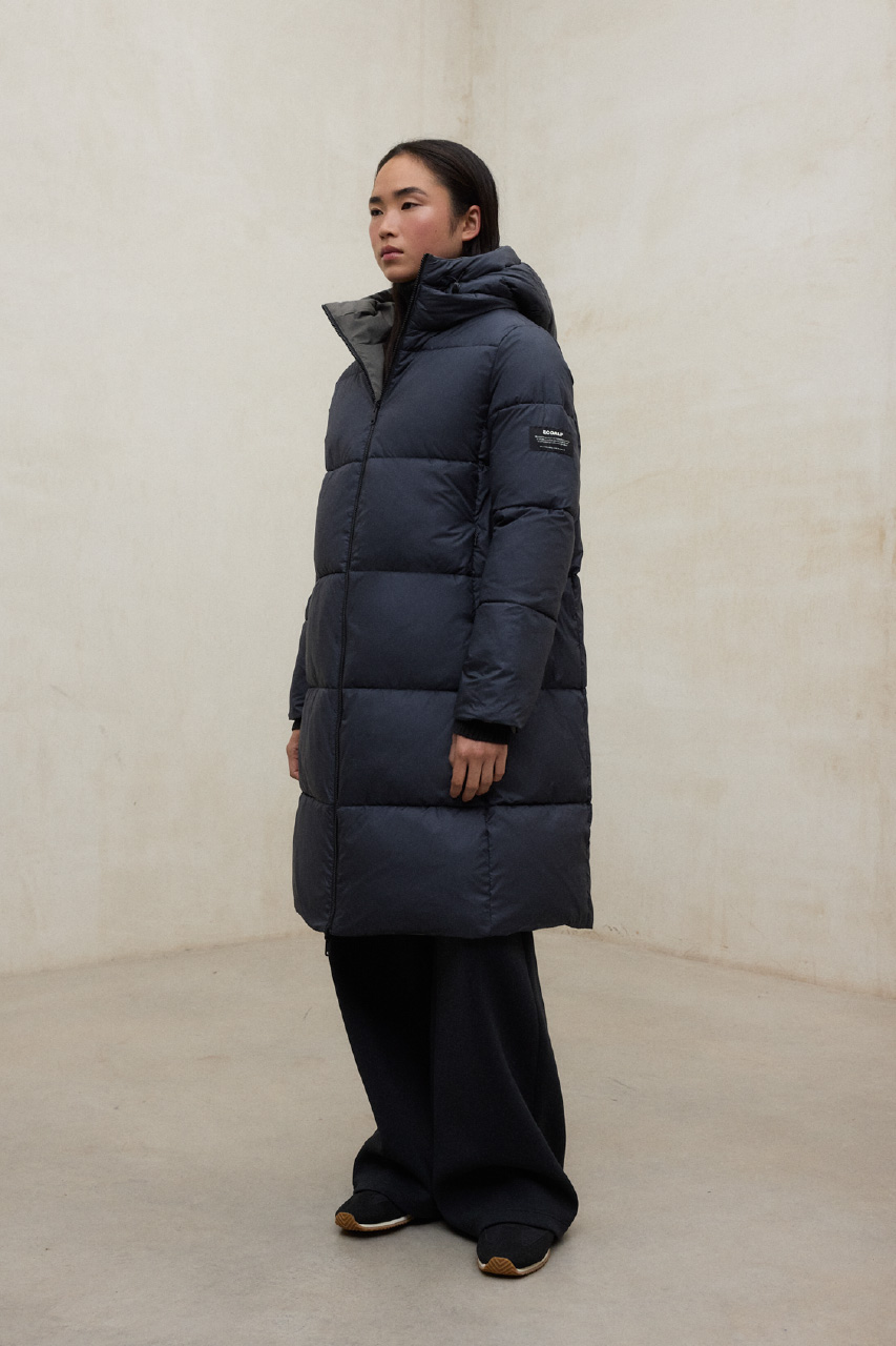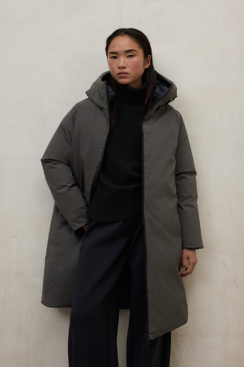ステッチ入りのスポーティーな面と、ノンステッチのクリーンでエレガントな面、2通りの表情を楽しめるリバーシブルアウター。ロング丈で真冬の寒さにも心強く、表地から中わたまでペットボトル由来の再生素材を使用しています。程よいハリ感とソフトで滑らかなタッチ。家庭洗濯可能なイージーケア性も魅力です。