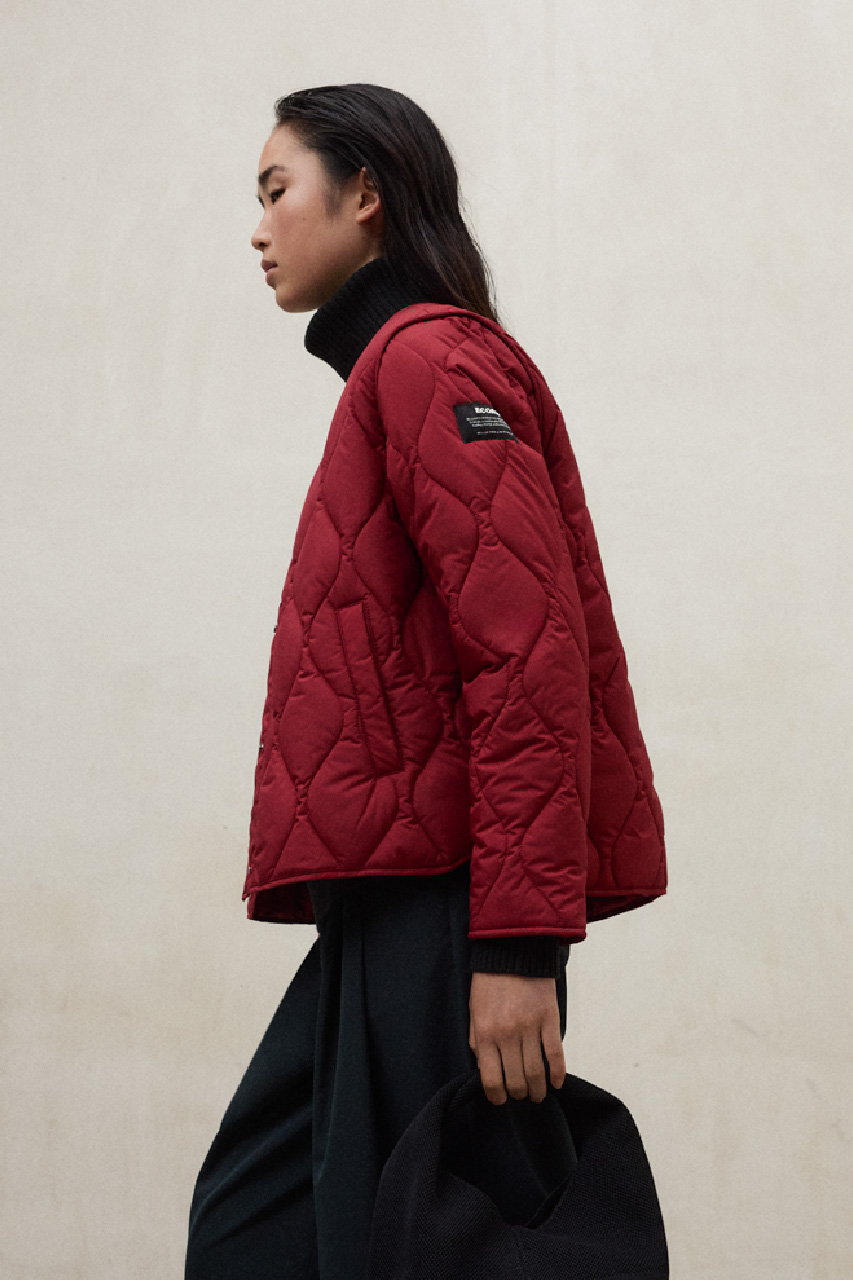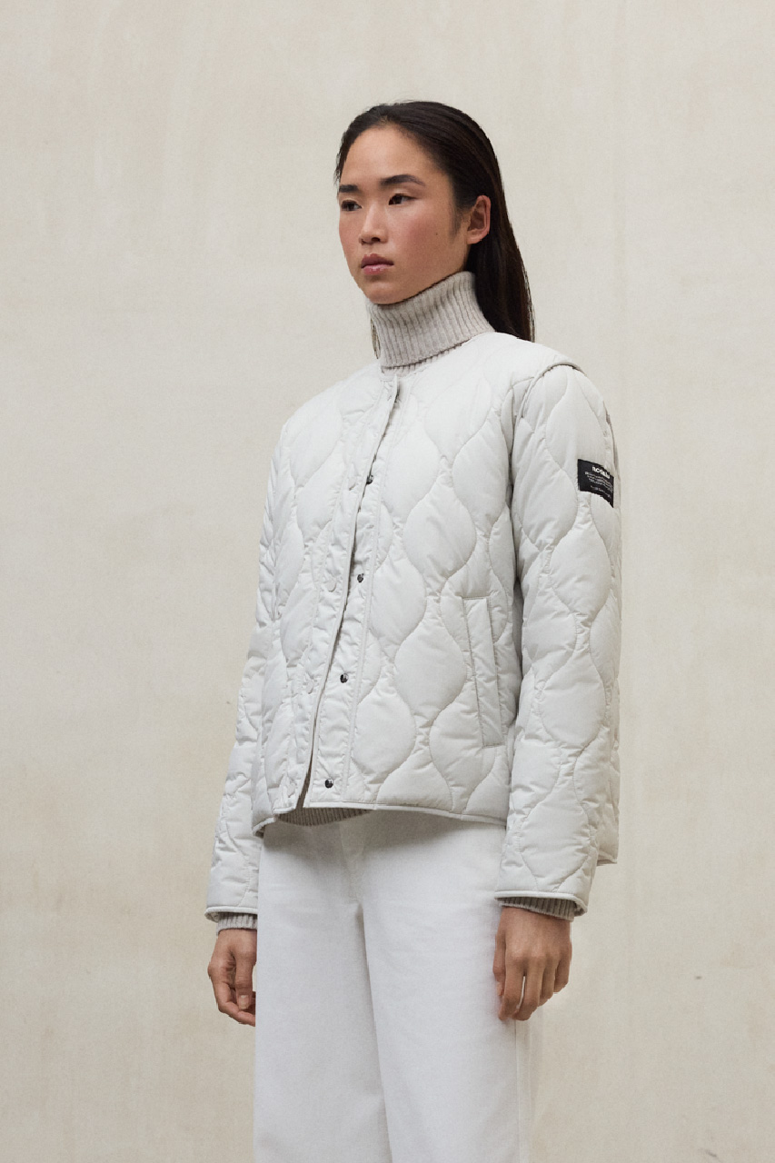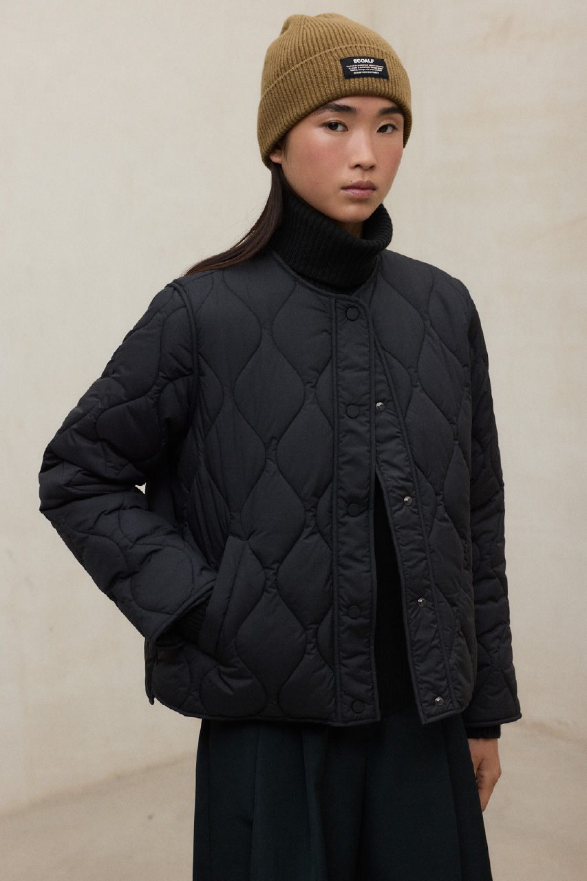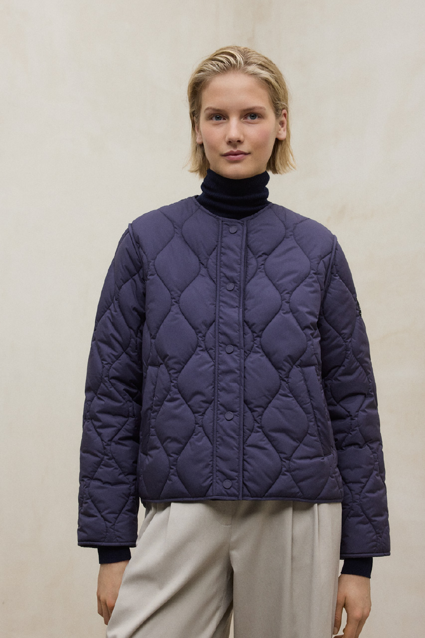 リラックス感のあるキルテッドジャケットが、新デザインで登場。ライトウェイトで快適な着心地が魅力の「エコアルフ」定番アウターです。オニオンシェイプのキルトとクルーネックで、すっきりモダンな印象に。表地から中わたまでペットボトル由来の再生素材を使用した仕様で、家庭洗濯可能なイージーケア性も備えています。