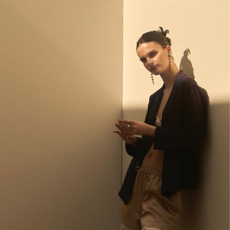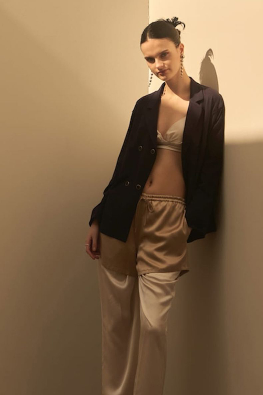 ダブルボタンパジャマのトップスには、ジャケットで用いられることの多い「ダブルボタン」のデザインを採用。パジャマでありながらエレガントなルックが特徴です。素肌の上からパジャマとして着ていただくのはもちろん、前ボタンを外して、Tシャツなどのインナーにさらりと羽織れば、リラックスアウターとしても大活躍。昼と夜の気温差が出始める夏から秋にかけての時期に、重宝する1着です。