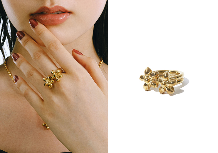 バルーンアートに着想を得たフラワーモチーフのフォルムが目を引き、手元のスタイルに鮮やかなアクセントを添えます。ゴールドが温かさとかろやかな表情を演出し、ひとつで存在感のある仕上がりに。日常のコーディネートにさりげなく華を添えるアイテムです。