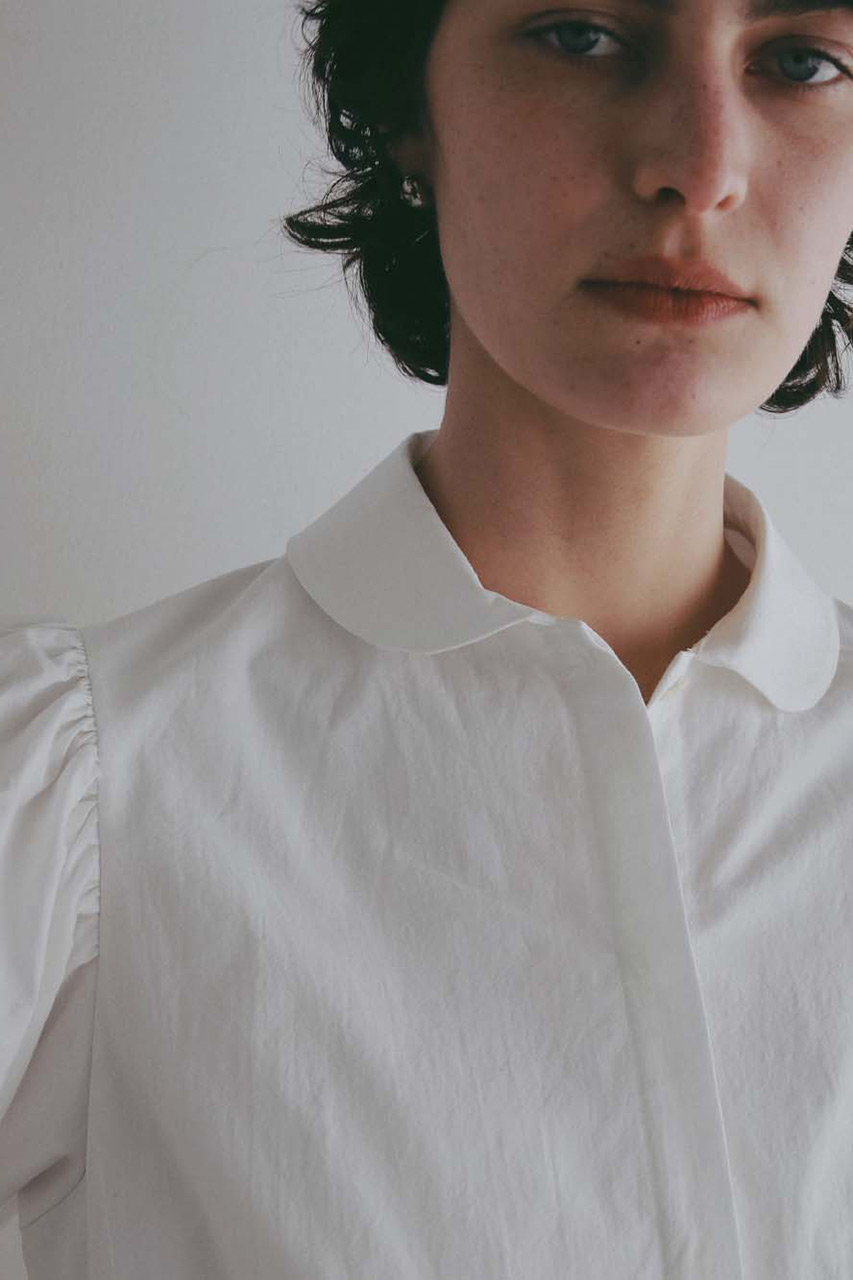 肩の部分に深いタックが重なるデコラティブで甘めなデザインですが、ボタンダウンの衿元が甘さを引き締めてくれます。