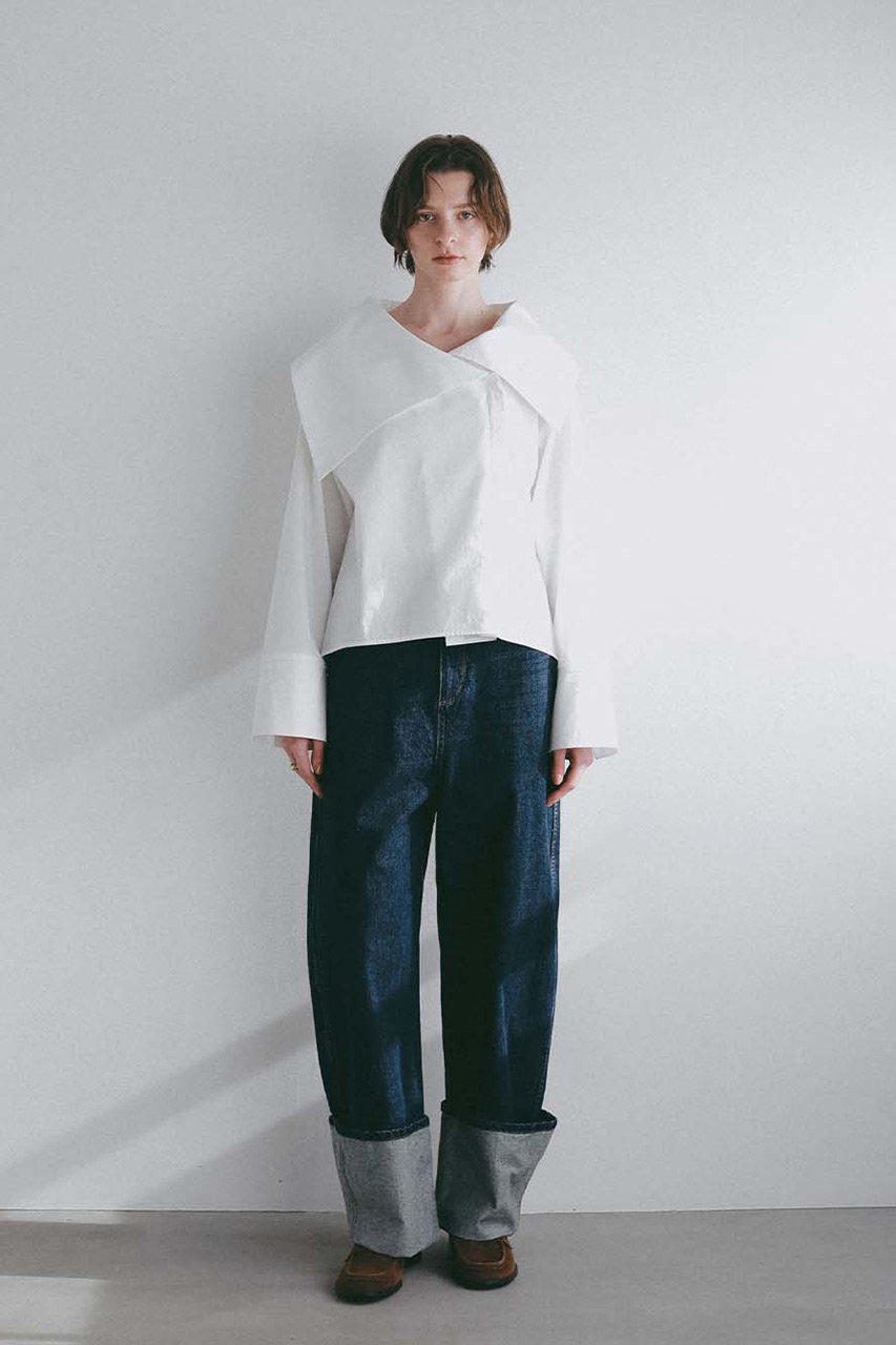 お顔回りを華やかに演出するアシンメトリーデザインの大きな衿が印象的なブラウス。