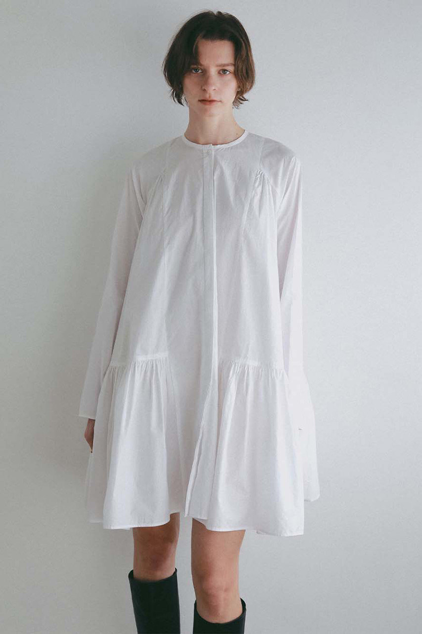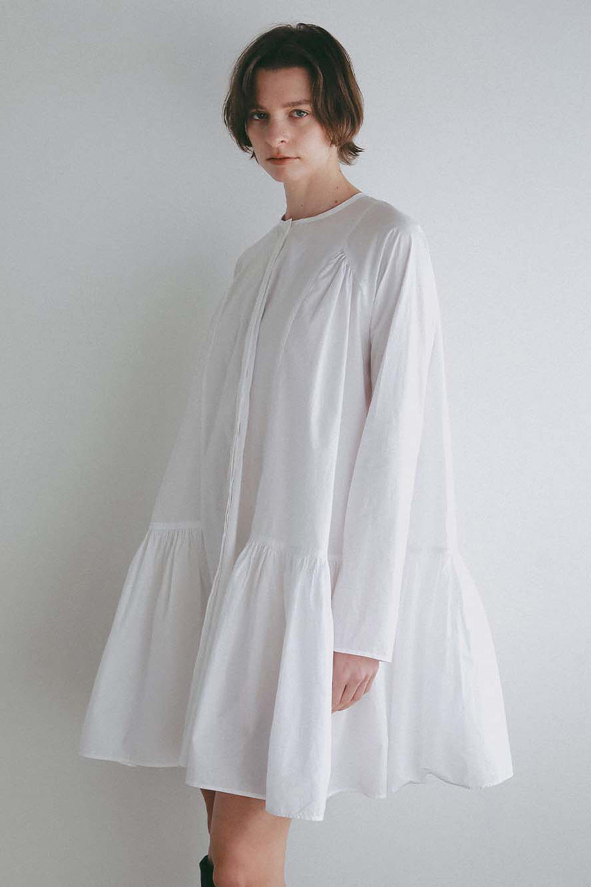 贅沢に使用した分量あるギャザーフレアが、動くたびに揺れて華やかな印象に。