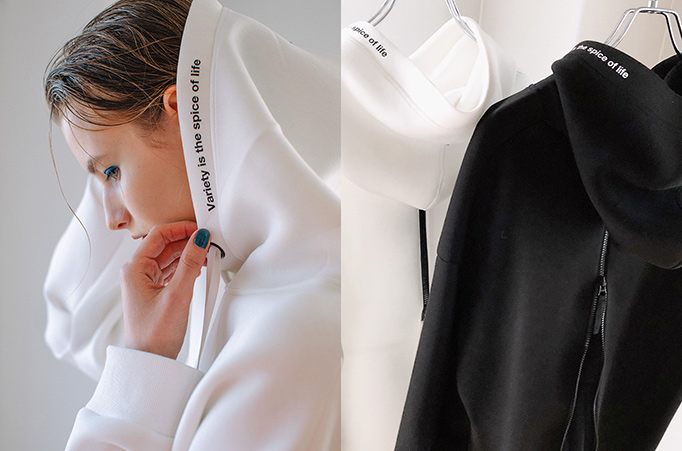 ダンボールジャージーにタフタをレイヤードしたコンビネーションフーディ。肌触りのよいダンボール素材を使用した、カジュアルになりすぎない立体的なシルエット。2WAY仕様のバックファスナーを開けると、チュールプリーツとタフタがのぞき、モードな印象に。ジップやアイレットなどはブラック塗装を施しエッジをプラス。リラックス感のあるオーバーサイズで、デイリー使いにおすすめのアイテムです。