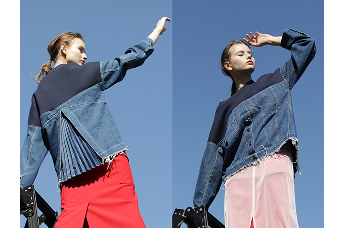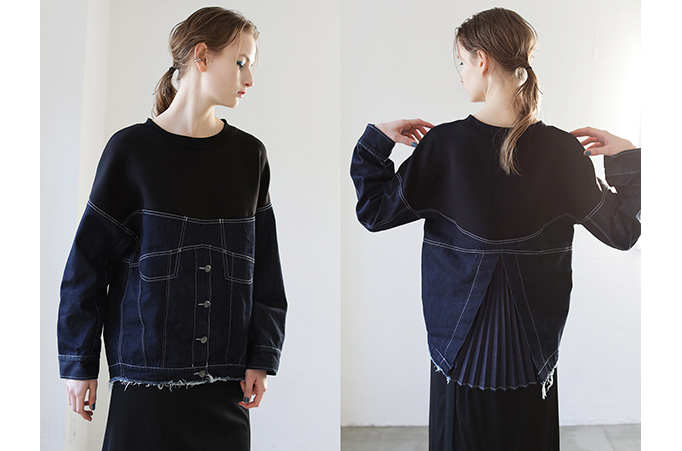 ダンボールジャージーと10オンスムラデニムの生地をドッキングしたような、リメイク風トップス。バックスタイルには後ろ下がりのプリーツを施すことでヌケ感をプラス。動くたびに広がる存在感のあるディテールが、ちょっとした動きでも女らしさを引き出してくれそう。