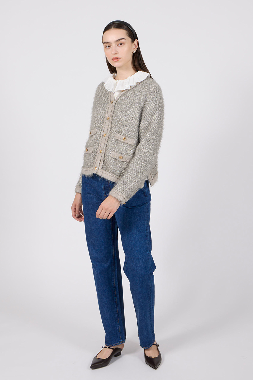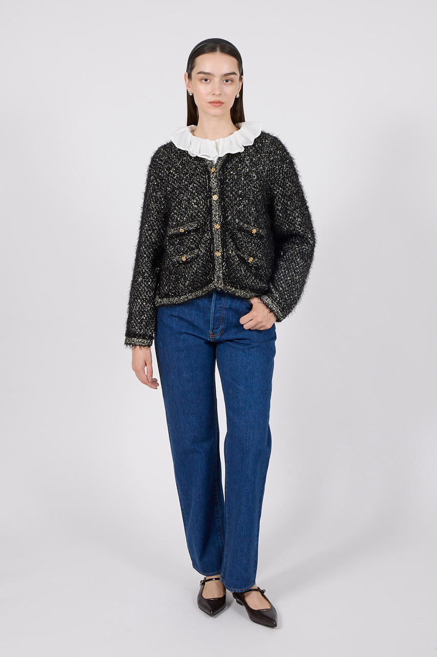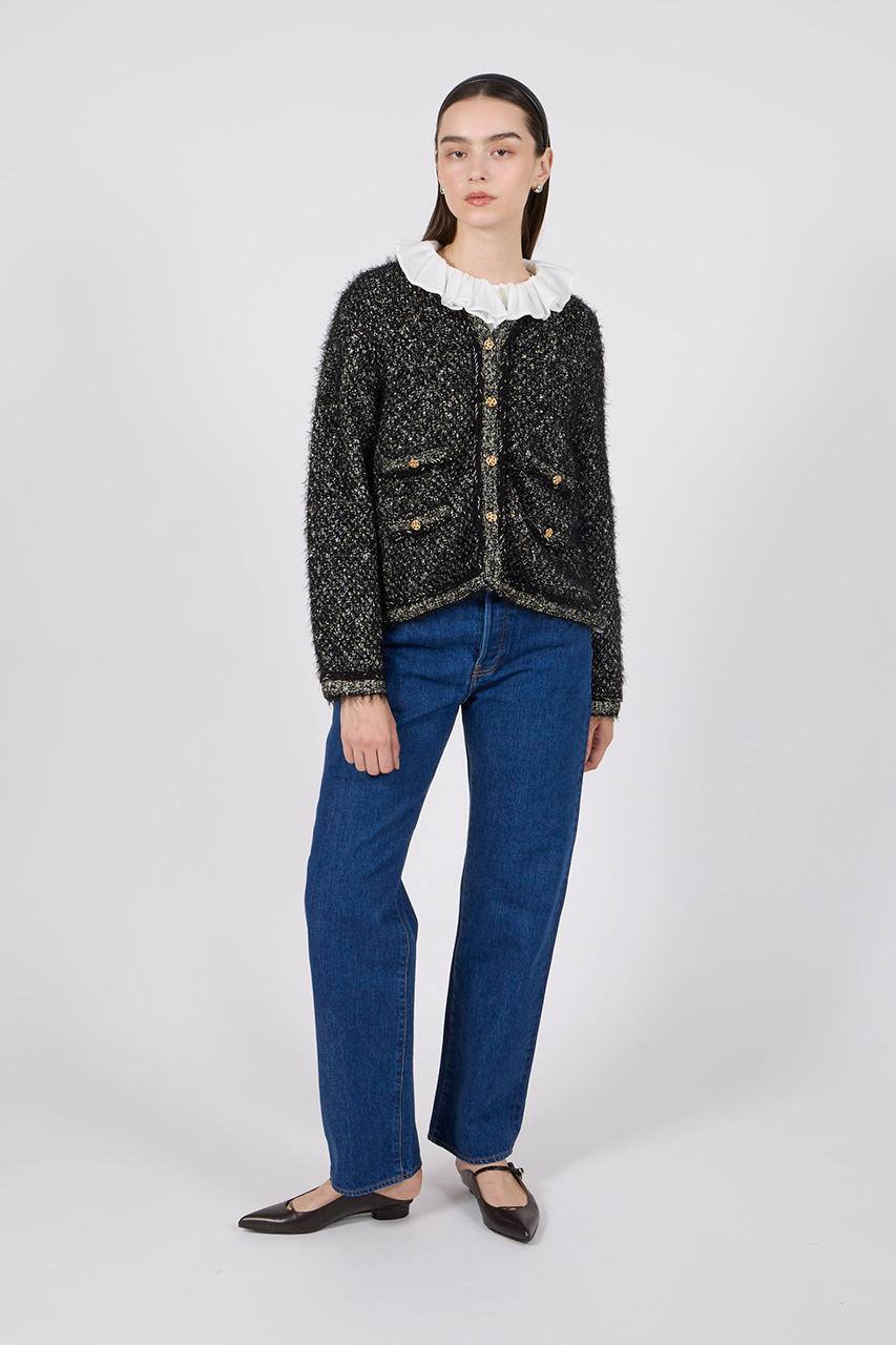 毛足の長い糸やラメ糸、スラブ糸など4種類の糸をミックスしたオリジナルの編み糸でツイード調に編み立てたニットジャケット。エル・ショップ限定でアップリケ無しのシンプルで使えるデザインに。華やかなブラウス合わせでオケージョンシーンにも活躍。カジュアルにTシャツ合わせも様になるアイテムです。