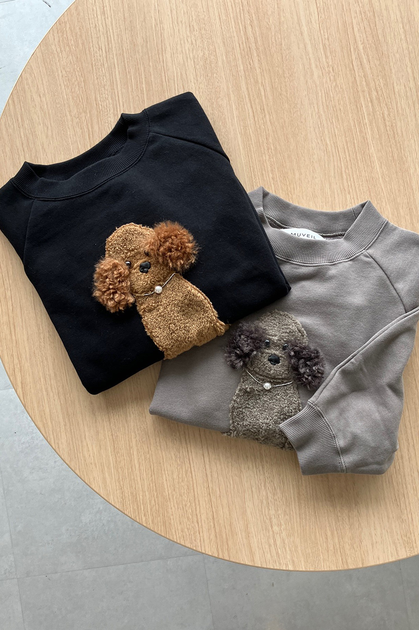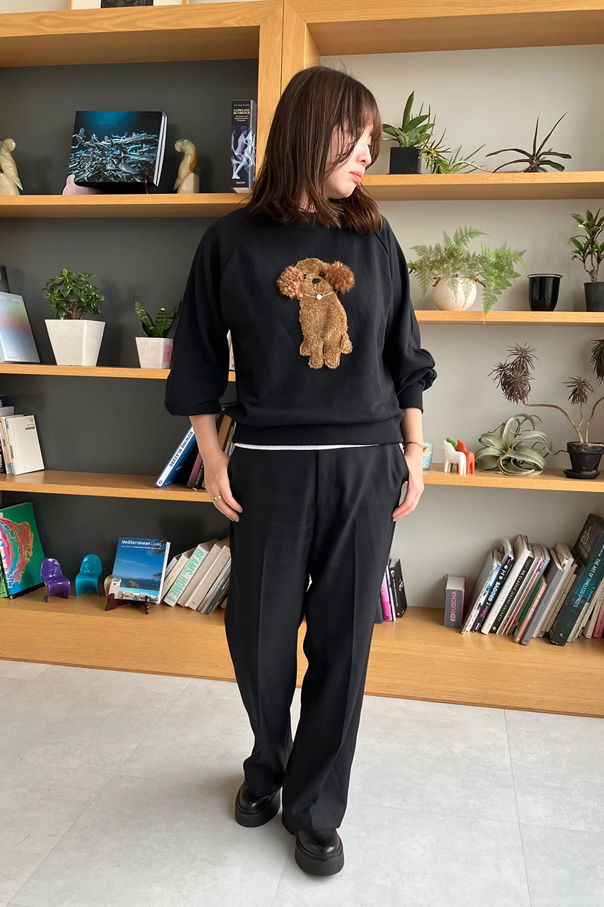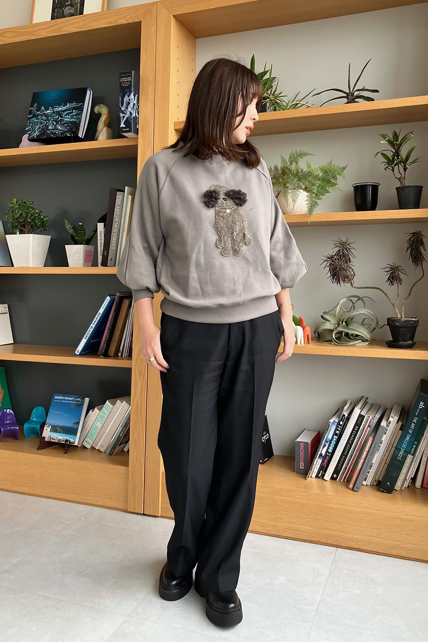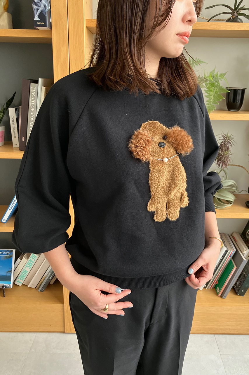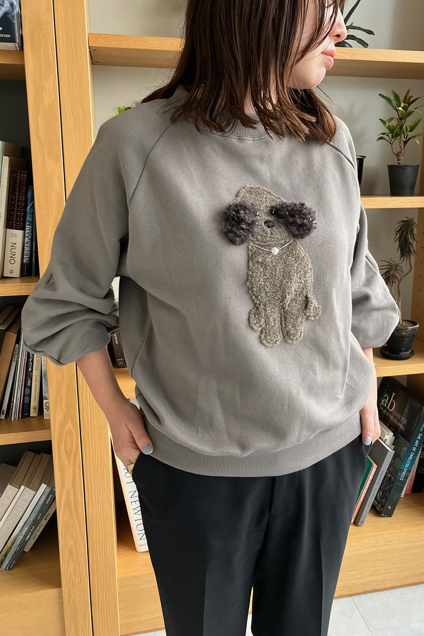ふわふわの毛並みがかわいいトイプードルに、大きめの一粒パールをほどこした首輪をアップリケしたボリュームスリーブのスウェット。ブラウスとレイヤードしたり、アレンジを楽しんで!