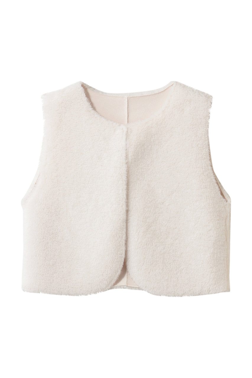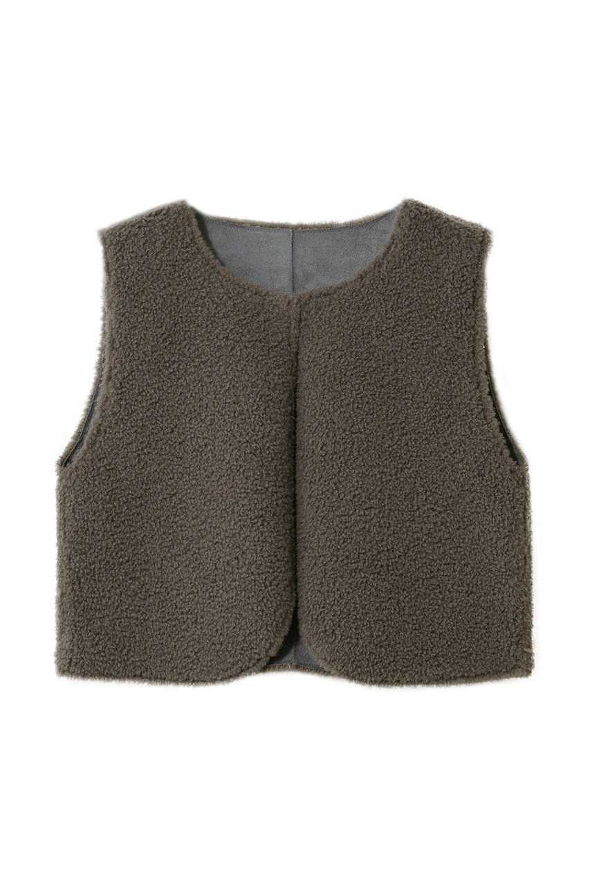 ラムボア調のフェイク素材が本物のような風合いを演出するジレ。ノーカラーのミニマルデザインで着回しやすく、ショート丈が旬のワンピースやボリュームボトムとも好相性。上品な存在感が魅力。