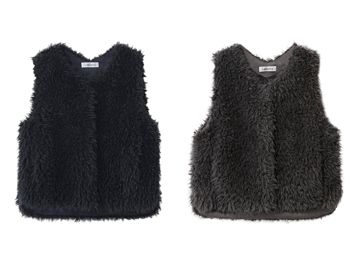ふわふわのフェイクファーで季節感たっぷりに仕上げたジレ。シンプルなデザインとベーシックカラー、コンパクトなシルエットで着回し力も◎。パーティからデイリーまで幅広く活躍する一着。