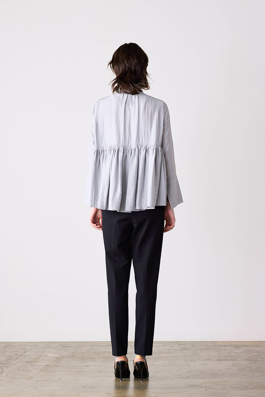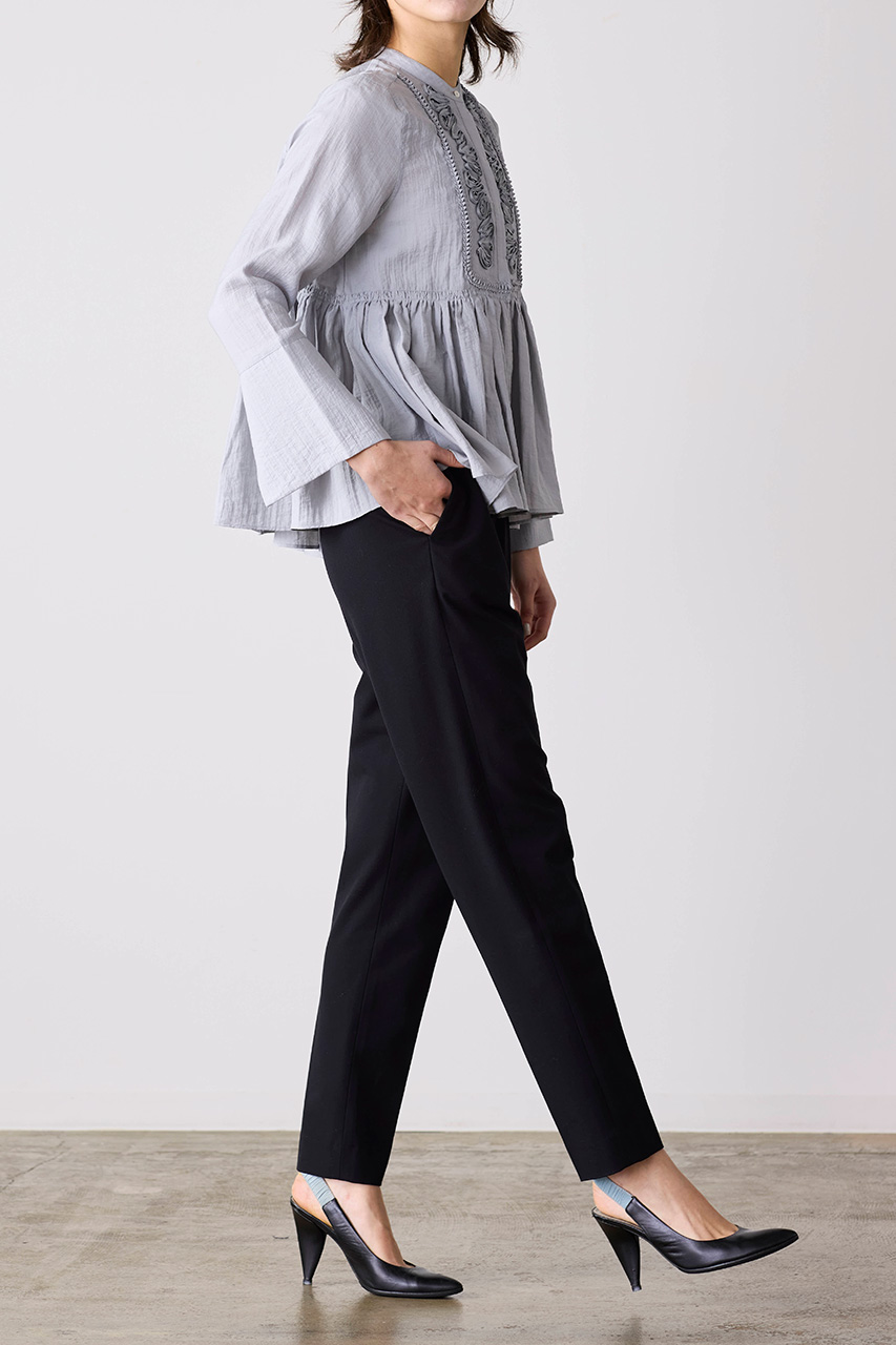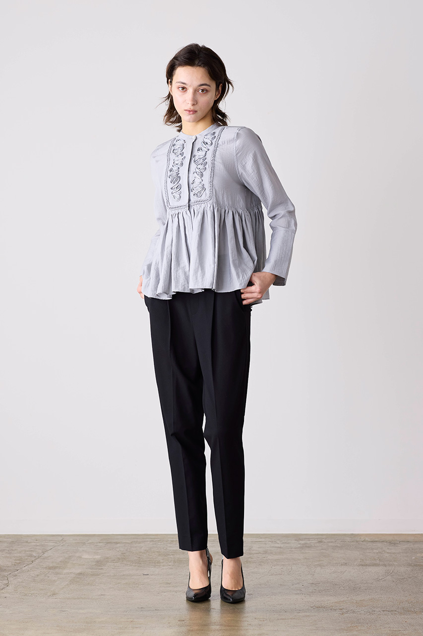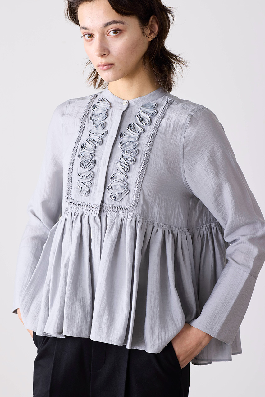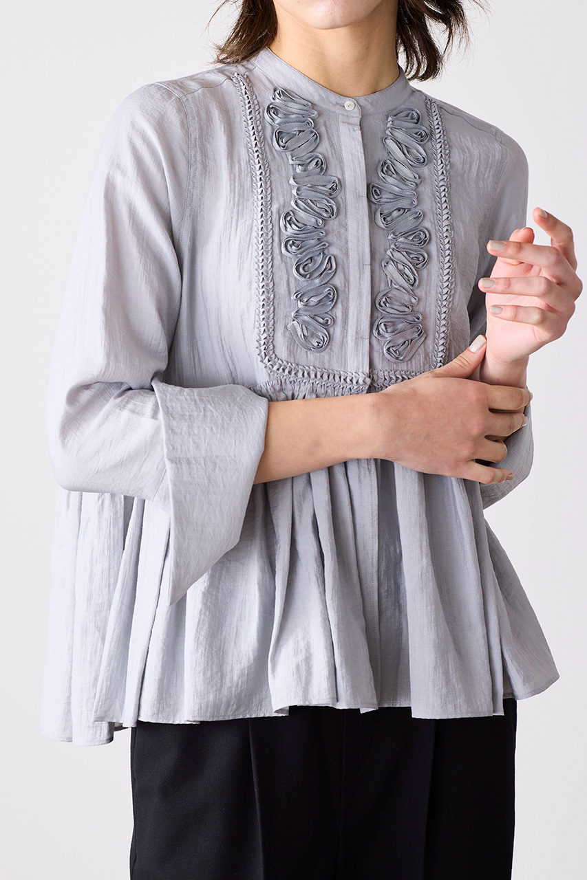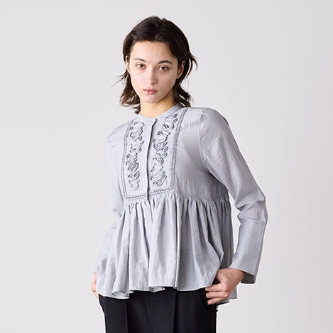 胸元のコード刺しゅうとダイヤタック刺しゅうが映える、ヴィンテージライクなフレアブラウス。シアーな光沢素材にギャザーを施した裾のデザインが華やかさをプラス。前開きで羽織りとしても使え、長めカフスはアレンジ次第でロングシーズン活躍します。