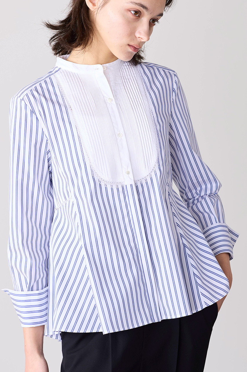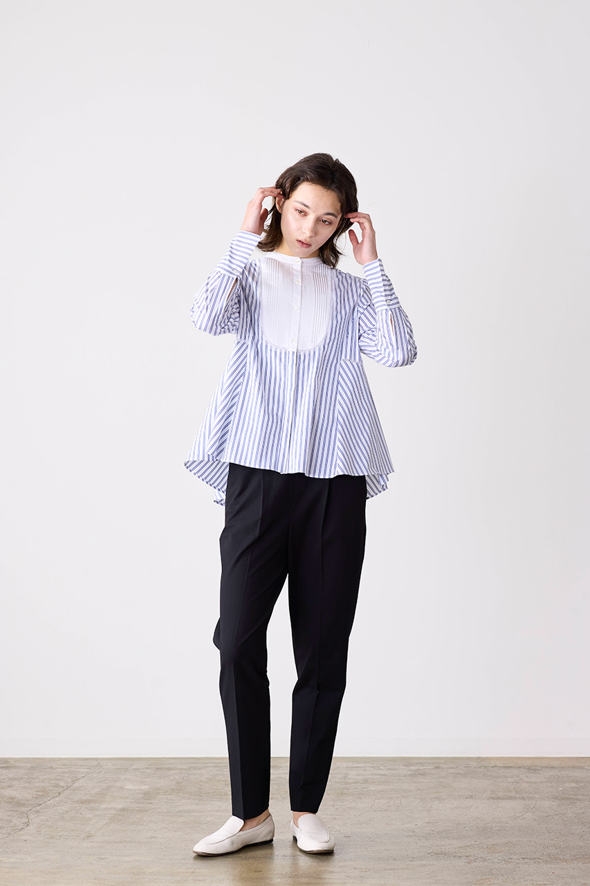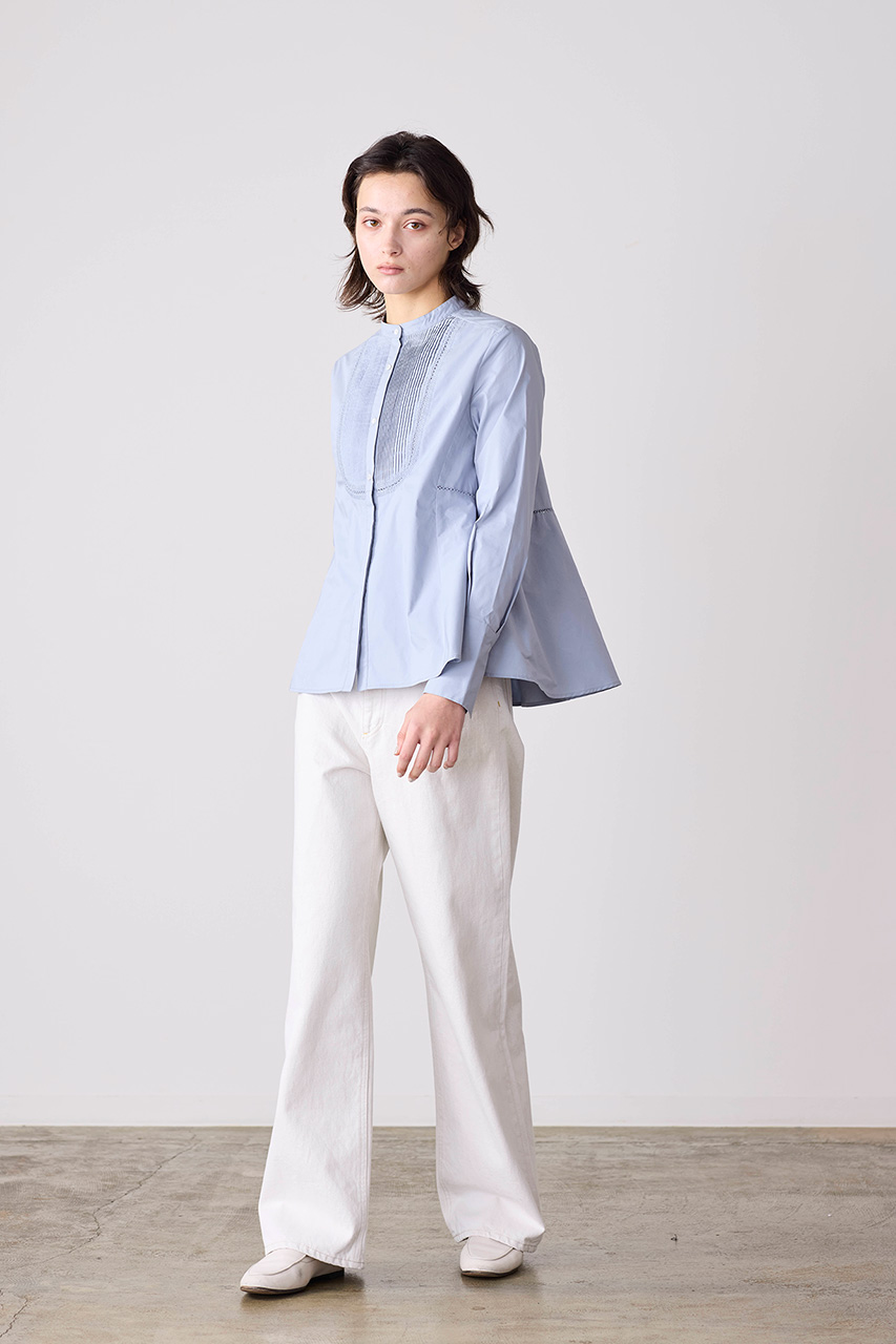 光沢とハリのある素材に、ピンタックやネオスカラップ&ダブルピコット刺しゅうを施したAラインブラウス。ジグザグ刺しゅうや透かし刺しゅうが繊細な表情をプラスし、フレアシルエットとシャープな袖でクリーンかつモダンに。一枚で着映える主役アイテムです。