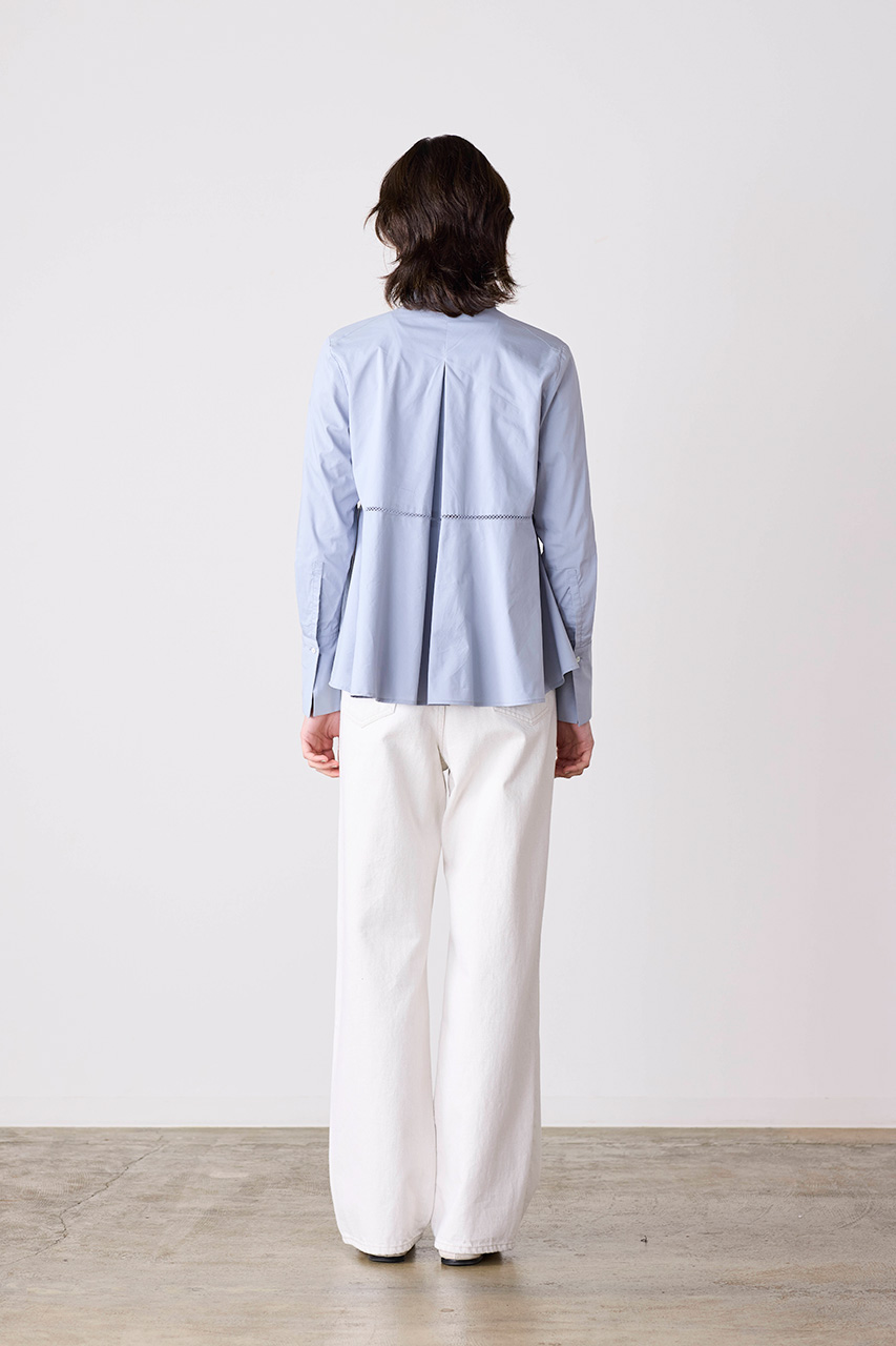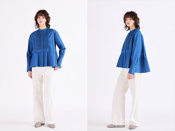 「マリリンムーン」で人気のタックフリルフレアシャツに、ELLE SHOP別注のデニム素材が登場。タックやピンタック、タックフリルが生む構築的なデザインに、フレアシルエットで華やかさをプラス。高めのウエスト切り替えでスタイルアップも叶い、幅広いスタイリングに活躍します。