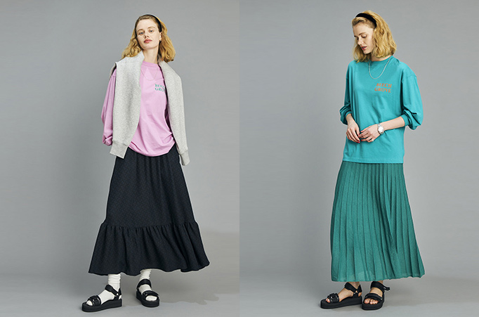 50年代のハリウッドスターをイメージしてグラフィックを組んだ“Beech Grove”T。鮮やかなグリーンや柔らかいピンクのカラーはコートのインナーに差し色としても◎。薄手のコットン素材なので、ボトムにインしやすく、ロングスカートと合わせたフェミニンなコーディネートもおすすめです。