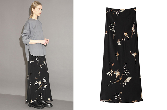 バイヤス裁ちで仕立てたスカートは、スッキリとしたナローラインで美形シルエット。秋口はシンプルなカットソーにブーツを合わせたり、ボリュームのあるトップスとも相性が抜群です。