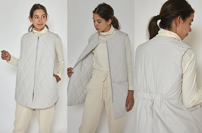これからの季節ニットなどとコーディネートして、スタイリングのポイントにしたいキルティングのベスト。オーガニックコットンの軽い着心地と温かな風合い、お尻まで隠れる長めの丈、首まわりのコンパクトさなど、随所に温かく過ごせる気づかいが凝らされているのは、女性に優しいものづくりをしている「ナナデェコール」ならでは。女性だからこその冷やしてはいけないポイントをしっかり守って、ファッションを楽しめるデザインです。ステッチが入った温かな風合いの表面と、光沢感のある上品な質感を堪能できる裏面のリバーシブルタイプ。ゆったりとしたシルエットなので、室内でもう1枚温かいものをというときにも活躍してくれます。着回し力抜群のベストで、この冬、あたなだけのスタイルを見つけてみて!