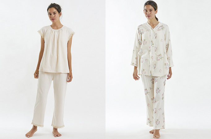 フェミニンなレース使いがポイントのパジャマたち。お部屋の環境に合わせてお好きな袖の長さや素材をチョイス。ほどよく汗を吸収してくれるガーゼ素材タイプ、心地よいタオルケットに包まれたい方は半袖タイプを。冷房の強弱や、肌掛けとの組み合わせで、お好きなタイプを選んでください。