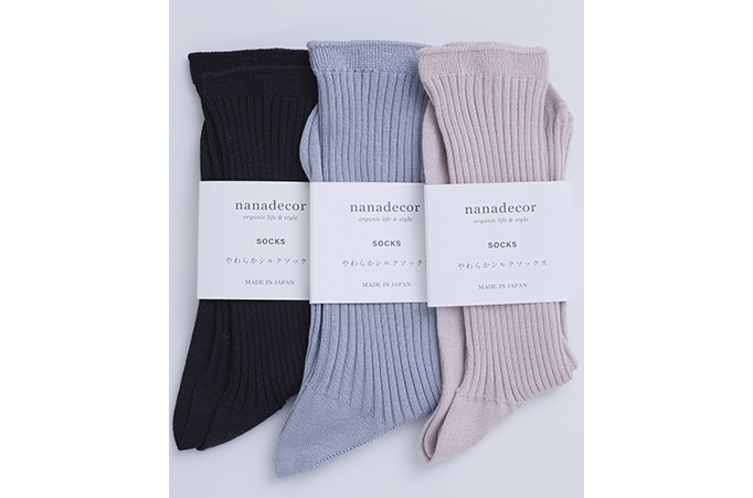 奈良の昔ながらの工場で、大切に作られたシルクのソックスです。「ナナデェコール」らしい細い番手のシルク糸を選び、ていねいに編み上げた、エレガントなシルクソックスです。