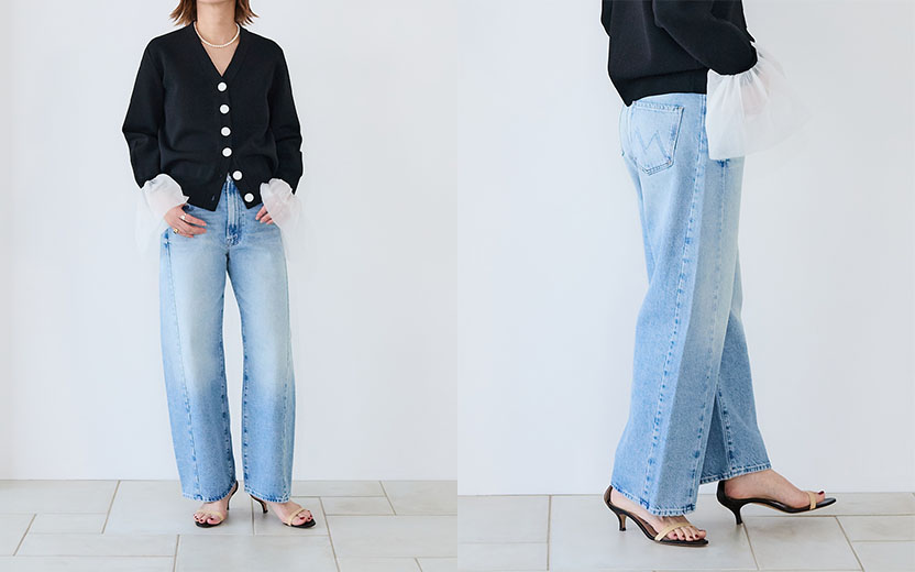 ワイドなシルエットでカーブデザインが特徴のデニムパンツは、ハイウエストで腰回りはすっきりと、脚のラインは丸みのあるフォルムで女性らしさを引き立たせてくれます。シンプルなトップスと合わせるだけでコーディネートにさりげない個性をプラス。