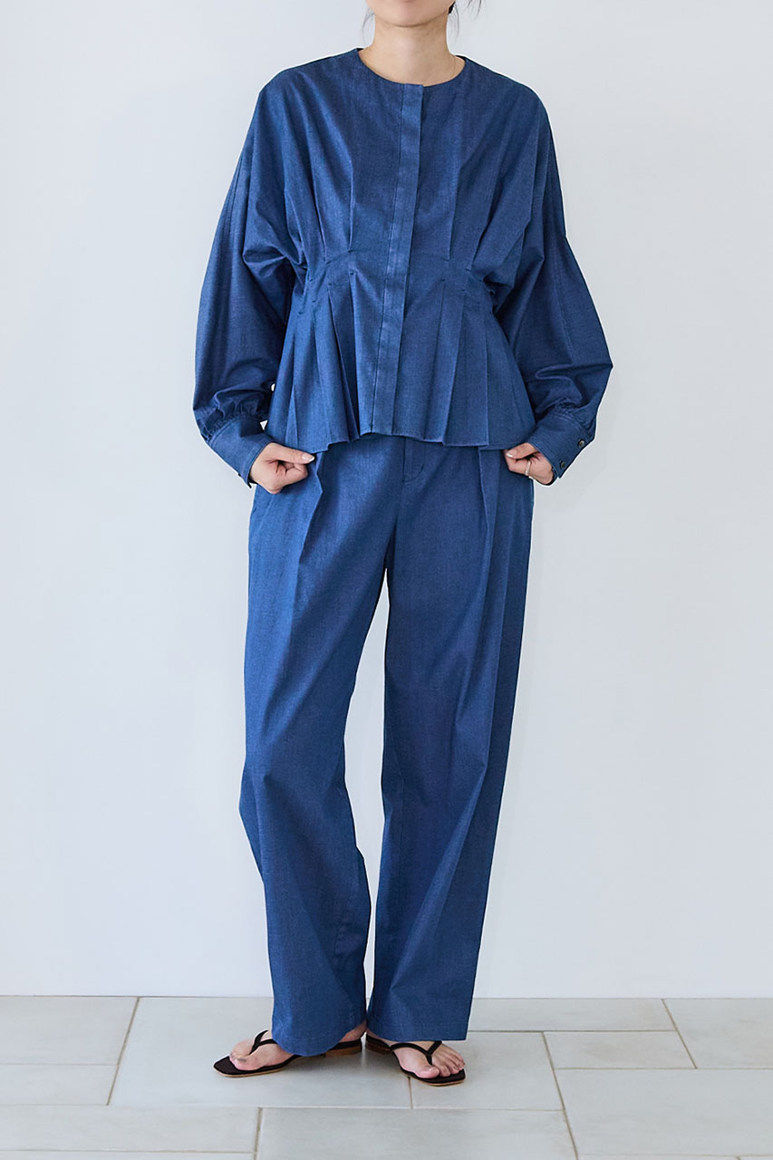 ストレッチ感のある綿素材を使用したデニムのような素材感のセットアップ。タックをふんだんにとった緩やかなペプラムラインが特徴のブラウスは、ドルマンスリーブで少し丸みのある女性らしいシルエット。深めに開いたスキッパーネックが抜け感を演出するデニムシャツは抜け感とシルエットのバランスで大人っぽく着こなせる一枚。