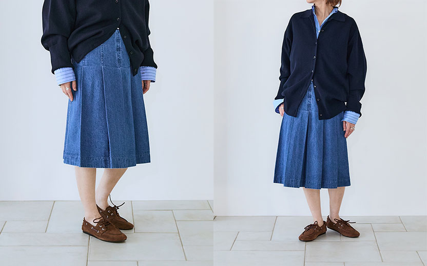 ローウエストで大人が履けるプリーツスカート。バックスタイルはスッキリとしているので大人も履きやすいシルエットになっています。